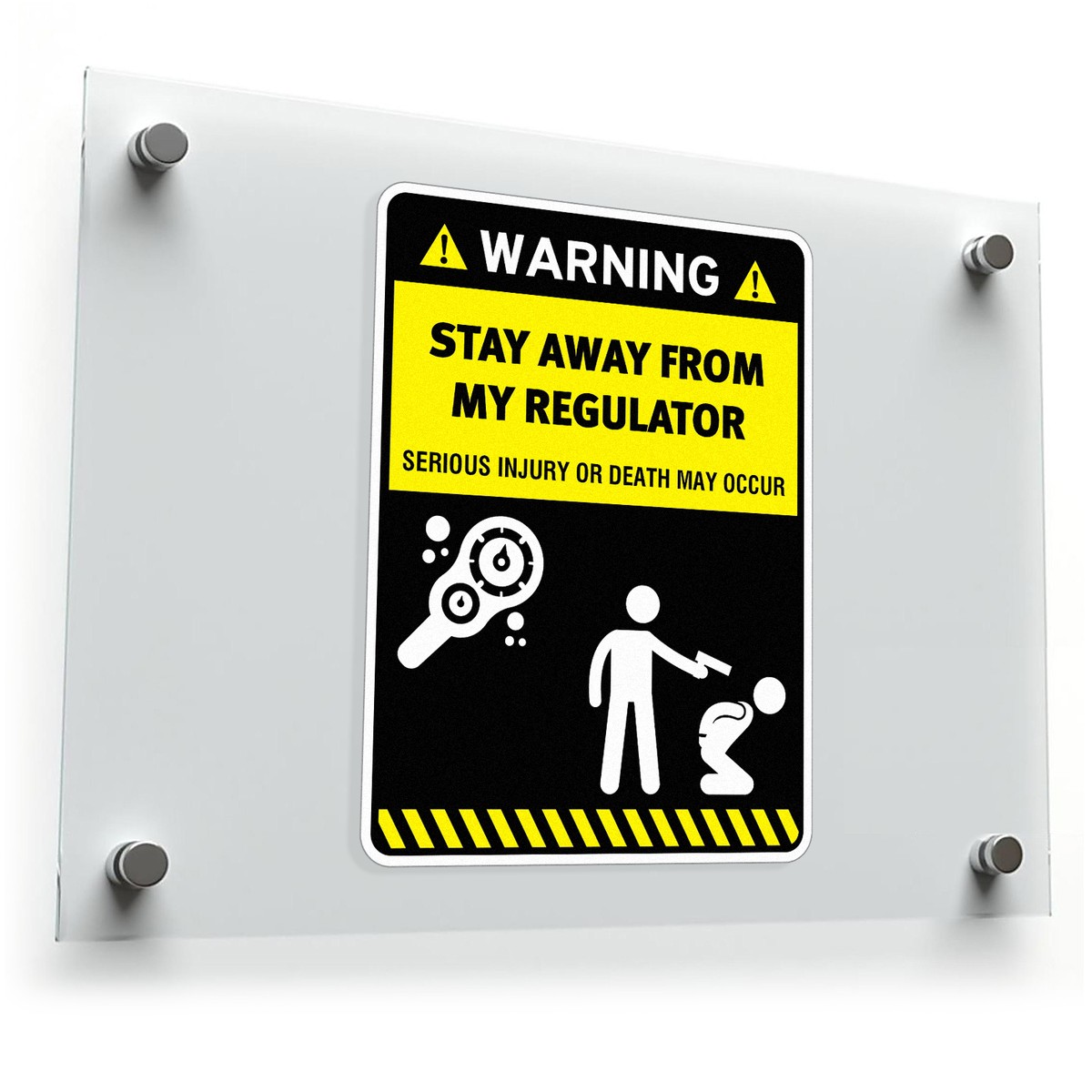 Ensure safety and prevent accidents in industrial and workshop settings with this “Stay Away from My Regulator” warning sticker. Featuring a bold black and yellow design with clear graphics, this decal ensures high visibility and effective hazard communication. Made from premium waterproof vinyl, it is durable and fade-resistant, capable of withstanding harsh environments indoors or outdoors. Perfect for equipment safety, this sticker is easy to apply and stays firmly in place, making it a practical and reliable safety tool. Available in multiple size options, this sticker is an essential addition to any workplace safety strategy.