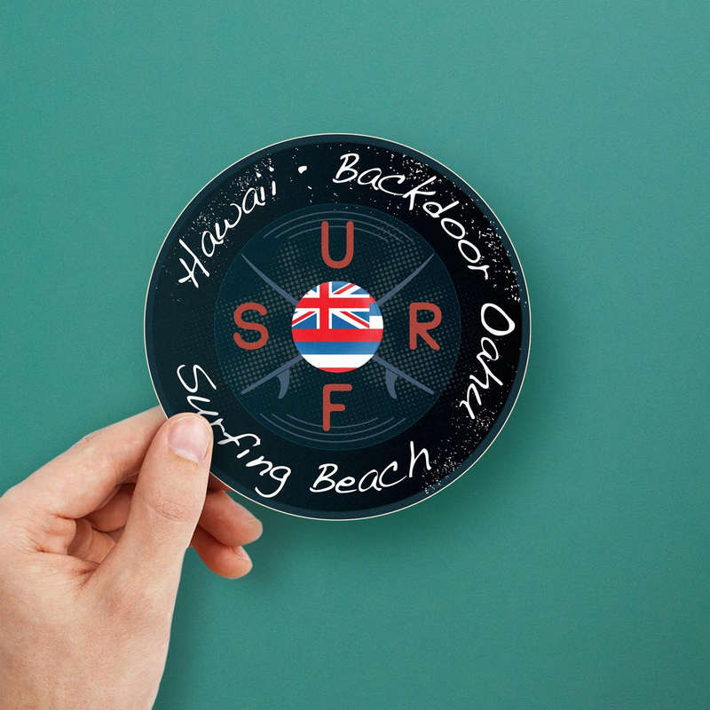 Celebrate the vibrant surf culture of Backdoor Oahu, Hawaii, with this “Hawaii Backdoor Oahu” round vinyl decal. Featuring a bold design with the Hawaiian flag, crossed surfboards, and modern typography, it’s ideal for personalizing surfboards, cars, laptops, or other smooth surfaces. Made from durable weatherproof vinyl, this sticker is fade-resistant and built to withstand any environment. Its easy application and residue-free removal make it a perfect choice for surfers, travelers, or tropical art enthusiasts. Available in multiple sizes, this decal adds a stylish touch of Hawaiian charm to your belongings.