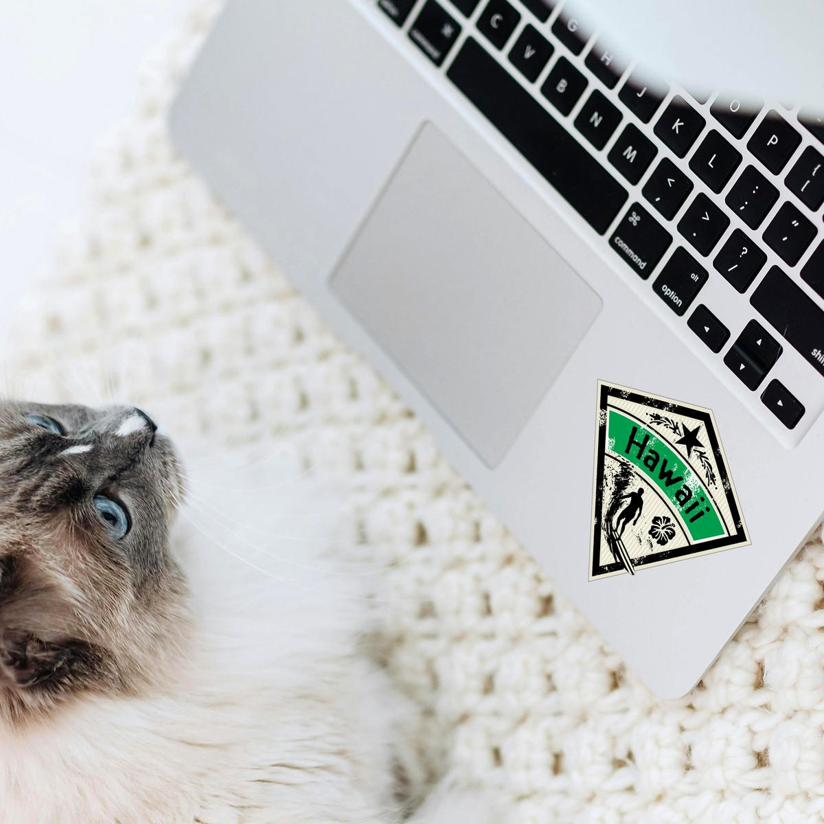 Embrace the laid-back Hawaiian surf culture with this vintage surf silhouette sticker. Perfect for cars, laptops, and travel gear, this durable vinyl decal is waterproof and weather-resistant, ensuring it can accompany you on all your adventures. The unique retro design showcases a surfer riding the waves, adding a tropical and stylish touch to your belongings. Easy to apply and remove without leaving residue, this sticker is a must-have for surfers, travelers, and anyone who loves the island vibe.