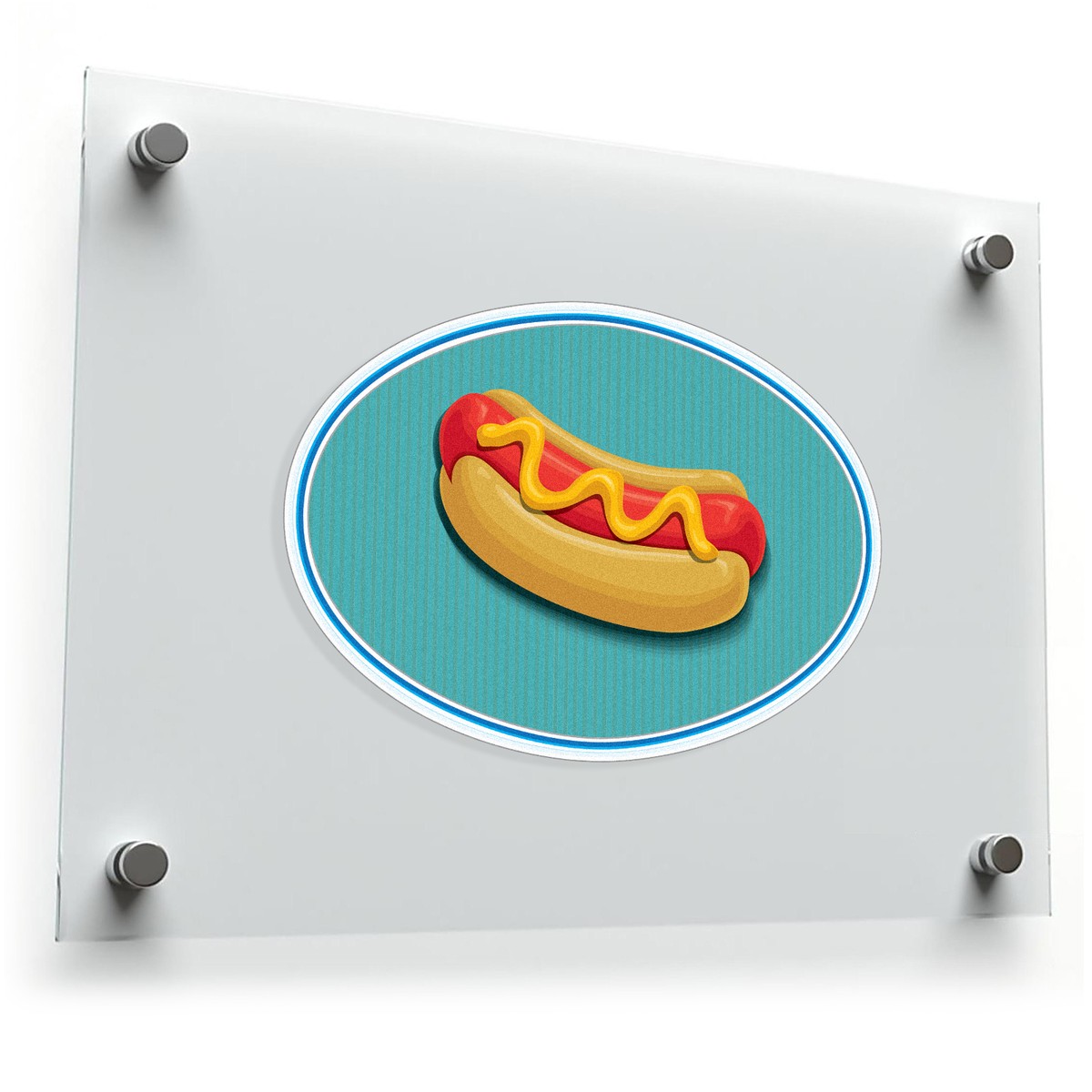 Hot Dog Vinyl Sticker 🌭 Playful Hot Dog Design: Featuring a vibrant hot dog topped with mustard and ketchup on a retro blue-striped background, this sticker adds a fun and quirky touch to your items. 🌭