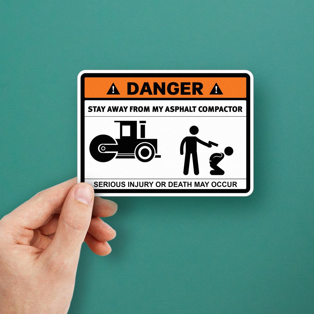 Add some humor to your workspace with this playful yet effective “Stay Away From My Asphalt Compactor” warning sticker. Featuring a bold orange and black design with funny illustrations, this vinyl decal is perfect for construction workers and equipment operators who want to make safety clear while adding a touch of humor. Made from durable vinyl, it can withstand both indoor and outdoor conditions, ensuring long-lasting use on construction sites. Available in multiple size options, this sticker is easy to apply and remove, making it a practical and fun addition to any workplace.