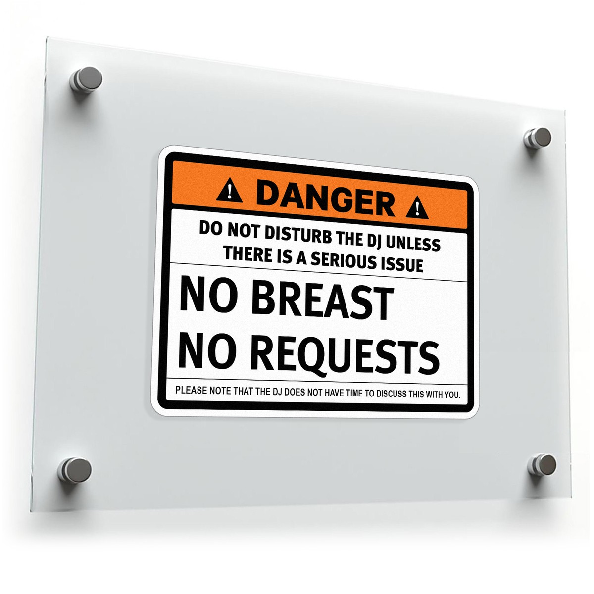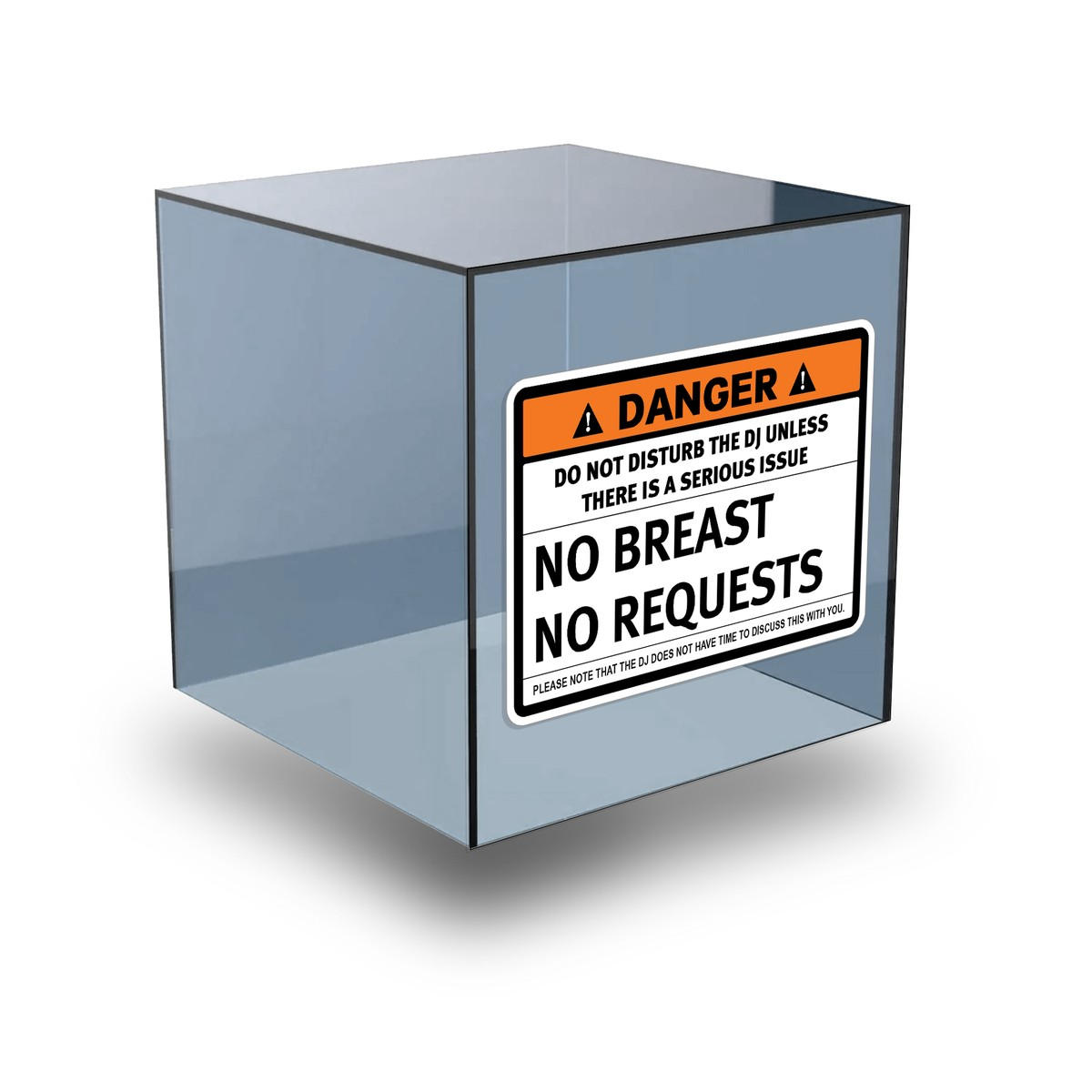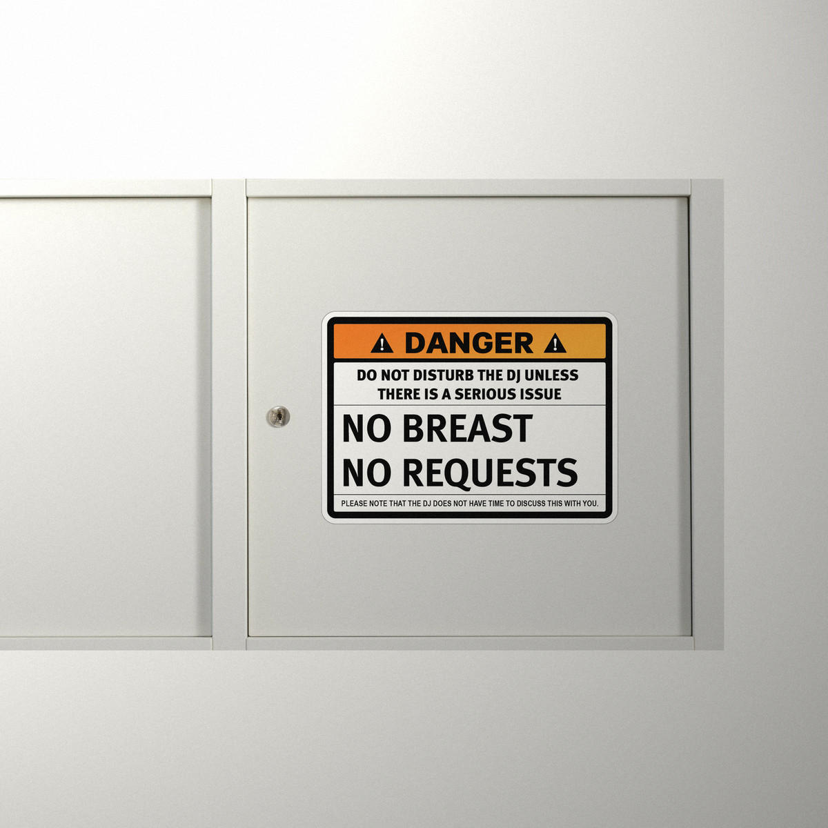 Add a touch of humor to your DJ setup with this bold “No Breast, No Requests” warning sign. Crafted from durable, waterproof vinyl, this sticker is ideal for DJ booths, parties, and music events. Its clear, eye-catching design ensures the message is seen by everyone, keeping unwanted song requests at bay. Easy to apply and remove without leaving any sticky residue, this humorous DJ sign offers flexibility for both short-term and long-term use. Available in multiple sizes to suit your event or party needs.