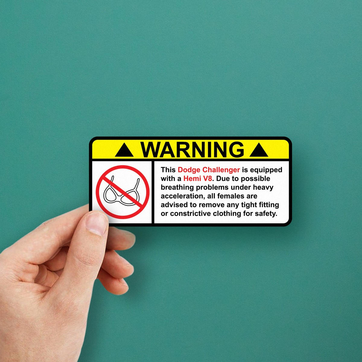 Humorous Dodge Challenger Hemi V8 Warning Sticker 😂 Humorous Design for Dodge Enthusiasts: This funny warning sticker for Dodge Challenger owners features a playful message about the Hemi V8 engine, sure to spark smiles from car lovers. 😂