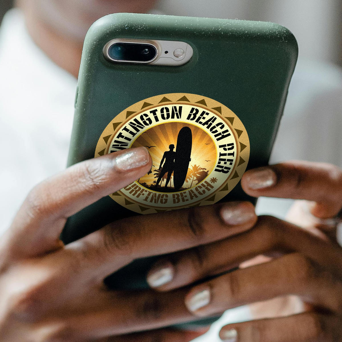 Huntington Beach Pier Surfing Vinyl Sticker 🏄 Retro Surfing Design: Celebrate the spirit of Huntington Beach with this retro-style surfing decal, perfect for adding a laid-back beach vibe to your car, laptop, or water bottle. 🏄