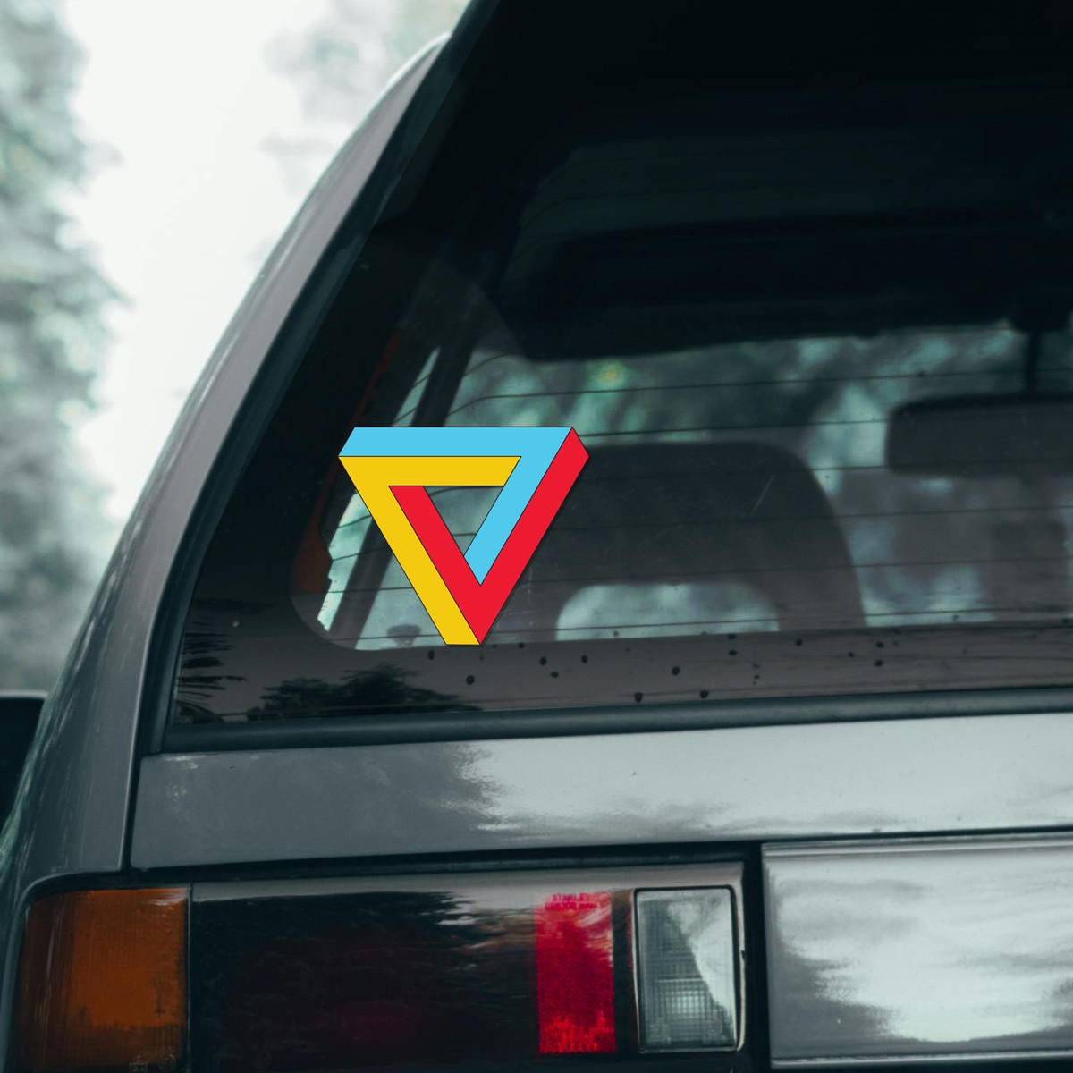 Make a bold statement with this impossible triangle geometric sticker, featuring a vibrant red, yellow, and blue color scheme. This optical illusion art piece adds a modern touch to any surface, from laptops and vehicles to walls and office spaces. Crafted from weather-resistant vinyl, this durable sticker is perfect for both indoor and outdoor use. Available in multiple sizes, it provides the flexibility to suit any decor or personal style. Add this striking geometric design to your collection and elevate your space with an eye-catching pop of color and creativity.