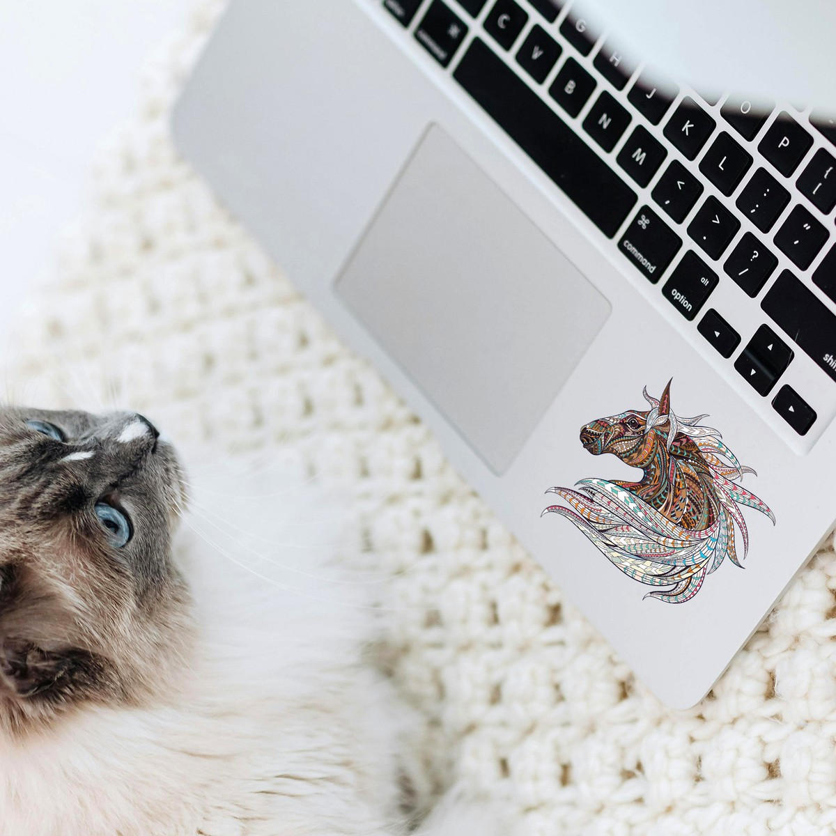 Add a touch of vibrant artistry to your personal items with this intricate horse head decal. Featuring a detailed and colorful design, this vinyl sticker is perfect for horse lovers and art enthusiasts looking to personalize their cars, laptops, or walls. Made from durable, weatherproof vinyl, this decal maintains its bold appearance indoors and outdoors. Available in three sizes, it offers flexibility for any surface. With its easy peel-and-stick application, you can quickly apply the decal to your belongings and remove it without leaving any residue behind.