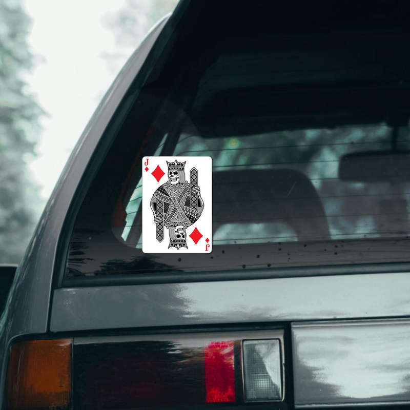 Unleash your edgy style with this Jack of Diamonds skull sticker, a perfect fusion of gothic elegance and playing card art. Featuring intricate black and red designs with a haunting skull twist, this vinyl decal makes a striking statement on laptops, cars, or walls. Made from premium weatherproof vinyl, it resists water, UV rays, and scratches for long-lasting durability. Whether used for personal expression or as a unique decoration, this sticker’s detailed artwork and bold colors captivate attention. Easy to apply and residue-free upon removal, this decal is a hassle-free way to showcase your love for gothic and playing card themes.