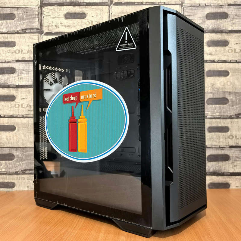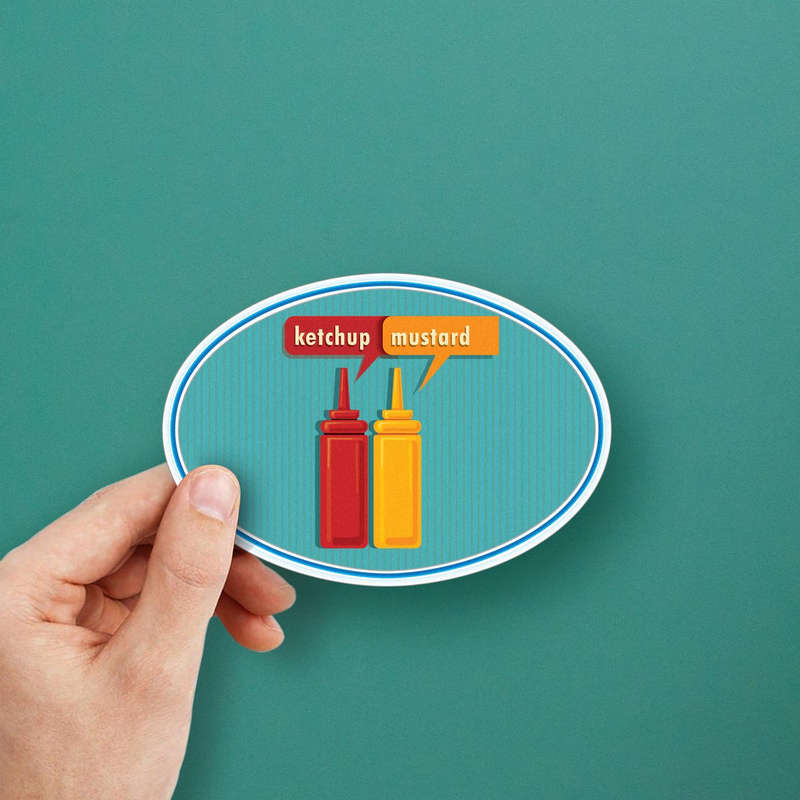 Add a splash of fun to your decor with this ketchup and mustard sticker, featuring vibrant red and yellow condiment bottles in a retro design with speech bubbles. Perfect for cars, laptops, kitchens, or water bottles, this playful decal brings a cheerful, diner-inspired vibe to any space. Made from durable vinyl, it resists water, scratches, and fading for long-lasting use. Easy to apply and remove, it offers a convenient way to personalize your items without residue. Available in multiple size options, this sticker is a charming choice for food enthusiasts and those who love creative, colorful designs.