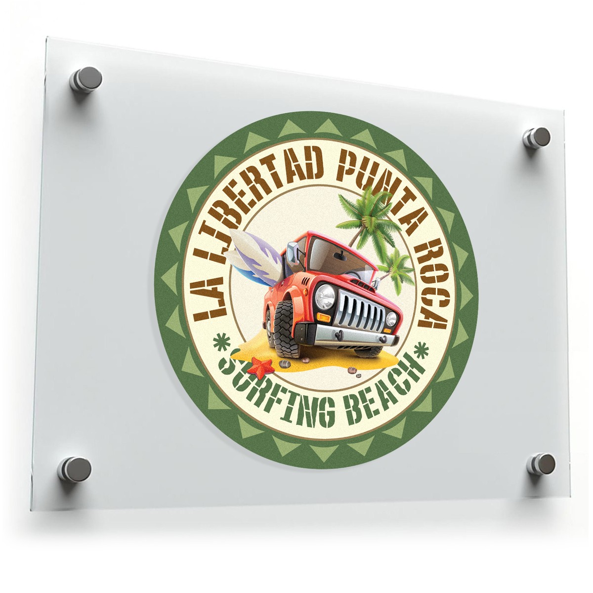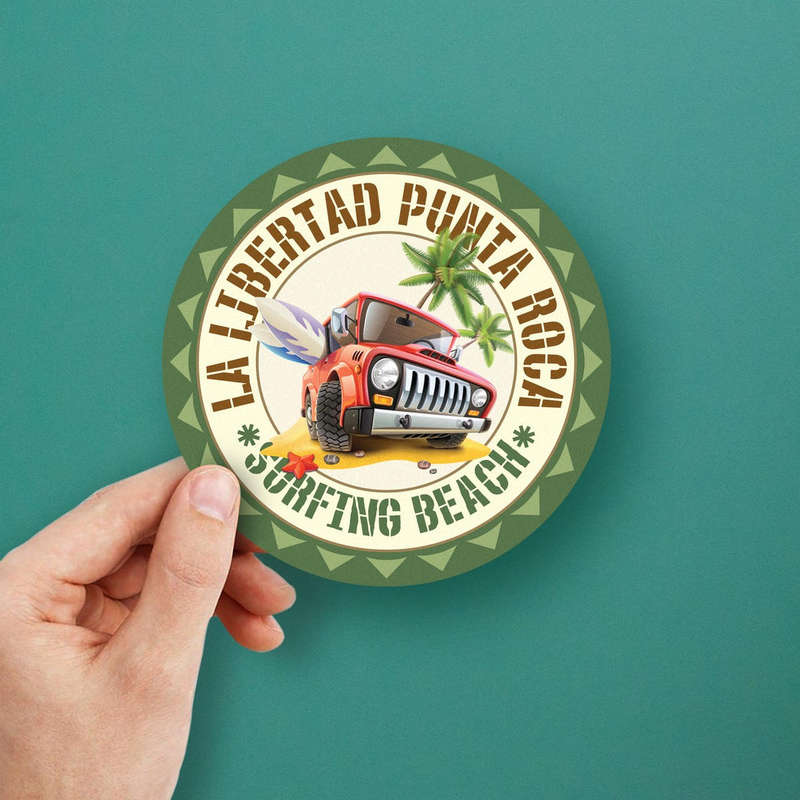 La Libertad Punta Roca Surfing Beach Vinyl Sticker 🏝️ Tropical Adventure Design: Capture the spirit of Punta Roca with this vibrant sticker featuring a red jeep, palm trees, and beach elements. Perfect for travel lovers and beach enthusiasts! 🏝️