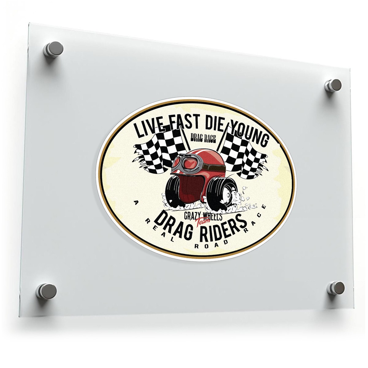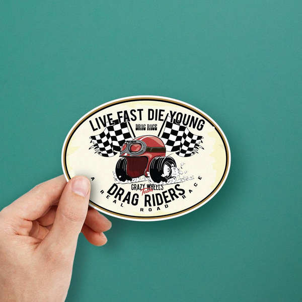 Celebrate your love for speed and vintage racing culture with this bold “Live Fast Die Young” drag race sticker. Featuring a retro hot rod, checkered flags, and striking typography, this oval-shaped vinyl decal perfectly captures the spirit of drag racing. Ideal for decorating cars, laptops, toolboxes, or notebooks, it’s crafted from durable, waterproof, and fade-resistant vinyl, ensuring long-lasting use indoors and outdoors. The easy peel-and-stick application allows you to personalize your items without leaving any sticky residue behind. With multiple size options available, this racing-inspired sticker is perfect for fans of road races and classic motorsport aesthetics.