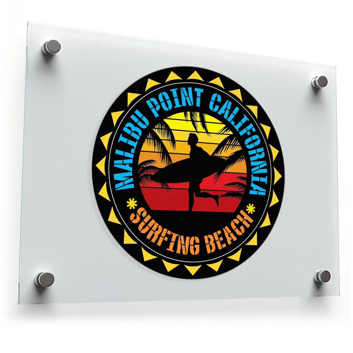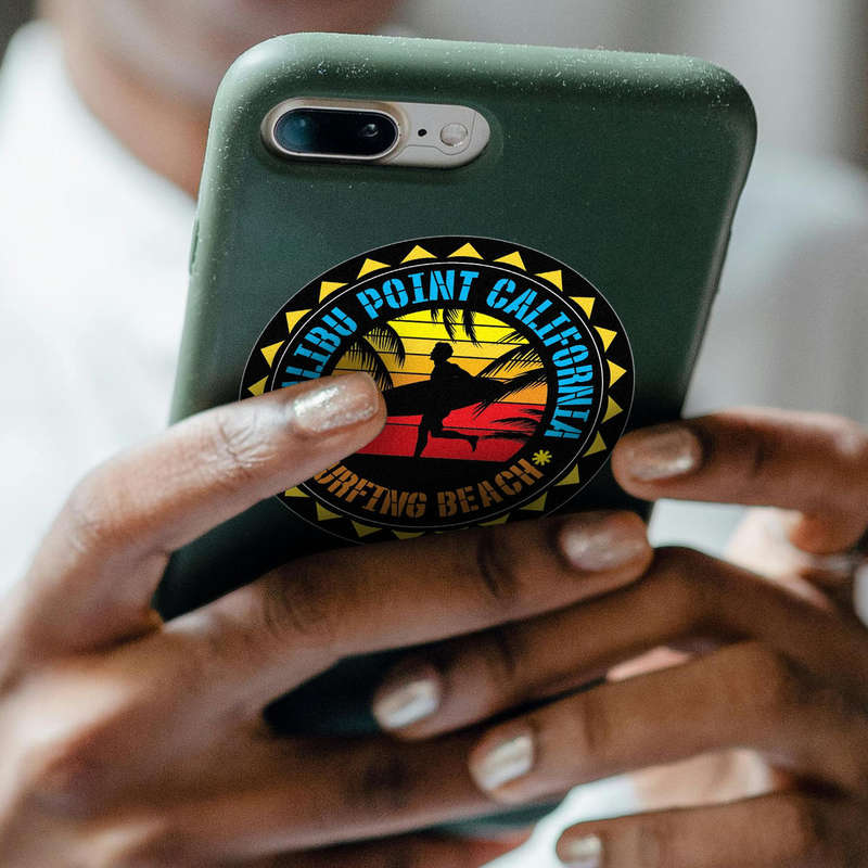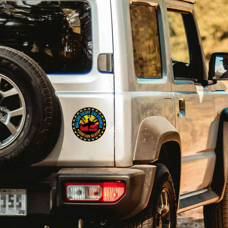 Celebrate the legendary surf culture of Malibu Point, California, with this vibrant retro sunset sticker. Featuring a bold surfboard silhouette against a stunning palm tree and sunset backdrop, this decal brings California’s iconic beach vibes to any surface. Made from durable, waterproof vinyl, it’s perfect for outdoor use on cars, water bottles, and laptops. Available in multiple size options, this stylish decal is a must-have for surfers, travelers, and those who love the laid-back California lifestyle.