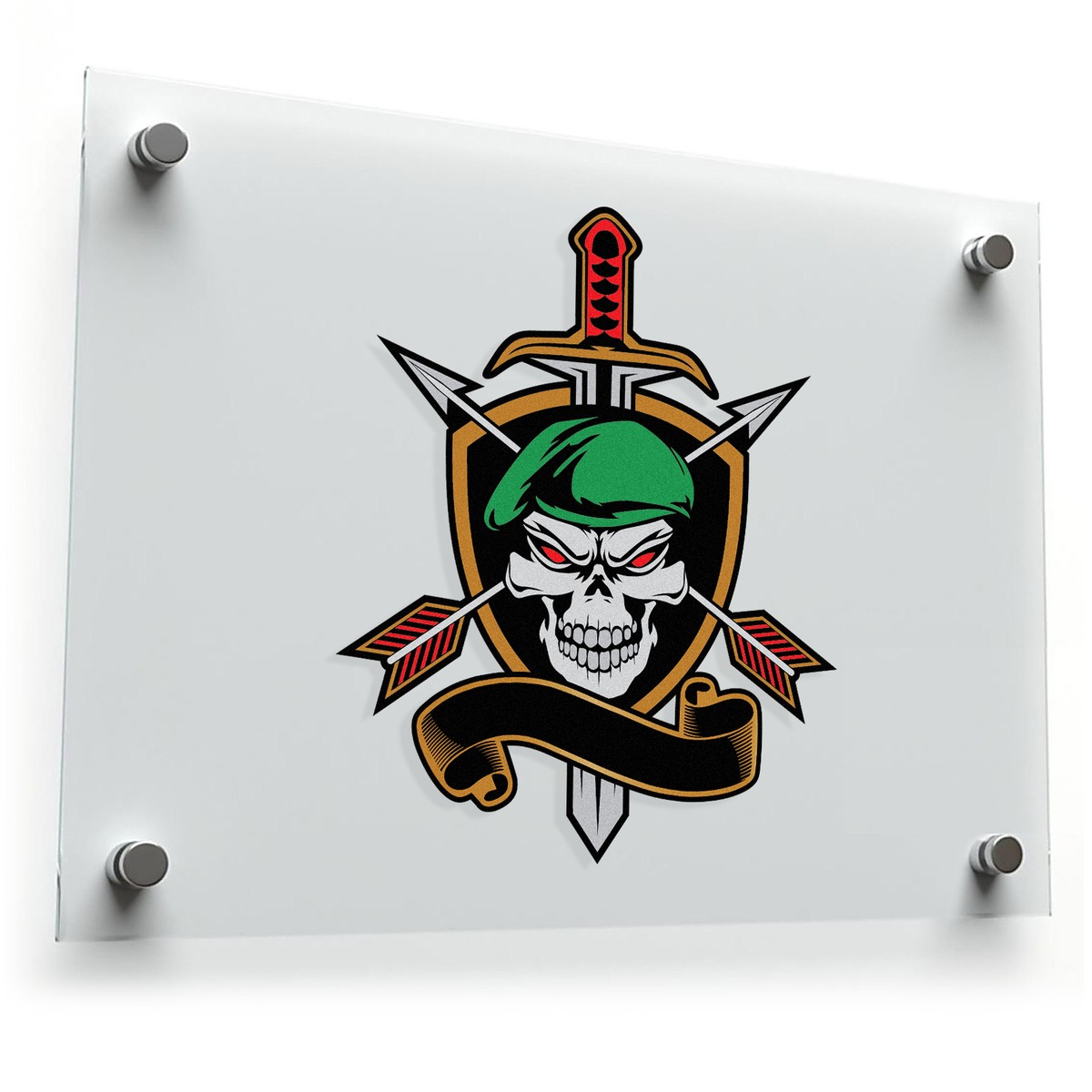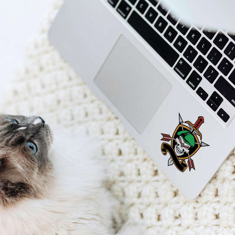 Show off your bold and tactical style with this military skull sticker, featuring a fierce skull in a green beret, complemented by a sword, arrows, and a striking shield backdrop. Made from durable, waterproof vinyl, this decal is designed to endure harsh outdoor conditions without fading. Perfect for personalizing cars, laptops, water bottles, or gear, it offers both durability and a rugged aesthetic. With easy application and residue-free removal, it’s a versatile choice for anyone who loves edgy designs or military-inspired decor. Available in multiple sizes, this sticker ensures a standout look wherever you place it.