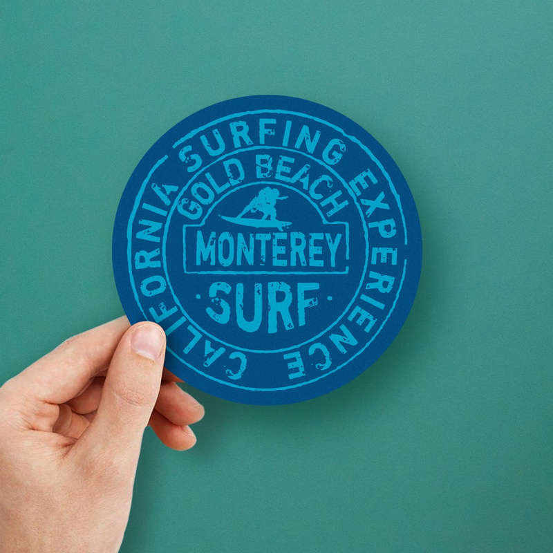 🎨 Eye-Catching Retro Style: Featuring bold blue tones and a circular design, this decal stands out with its vintage surf logo that captures the spirit of Monterey’s beaches. 🎨