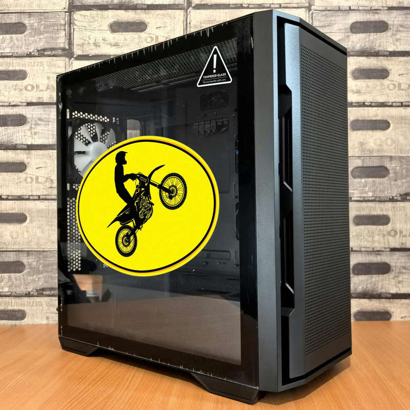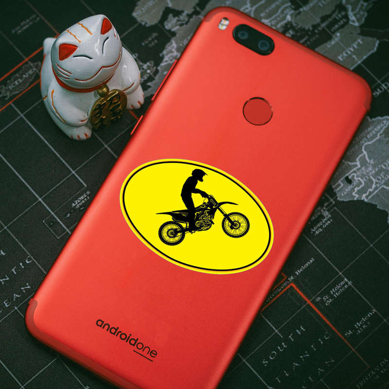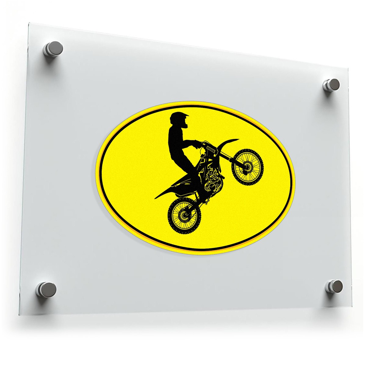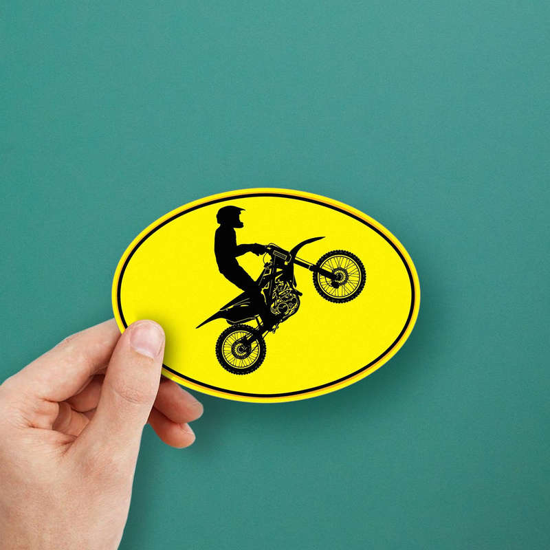Fuel your passion for motocross with this bold yellow oval vinyl sticker, showcasing a dirt bike rider silhouette mid-wheelie. Crafted from durable, waterproof vinyl, this decal stands up to the elements, ensuring long-lasting use indoors or outdoors. Its peel-and-stick design allows for quick and hassle-free application on cars, laptops, helmets, or gear, making it a versatile choice for fans of extreme sports. The vivid yellow background and dynamic design make it a standout accessory for adventure enthusiasts. Available in multiple size options, this sticker is a must-have for dirt bike lovers.