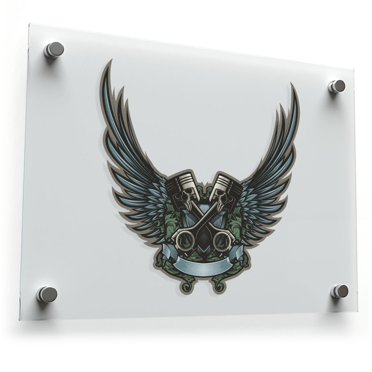 Unleash your inner biker with this motorcycle piston wings vinyl decal. The bold black and blue design features crossed pistons with detailed wings, embodying strength and speed—perfect for decorating cars, bikes, laptops, or DIY projects. Made from premium vinyl, it is durable, fade-resistant, and easy to apply with a simple peel-and-stick process. This decal removes cleanly without residue, making it ideal for temporary or permanent personalization. Available in multiple sizes, it adapts seamlessly to various surfaces, adding a bold, mechanical aesthetic wherever you choose to place it.
