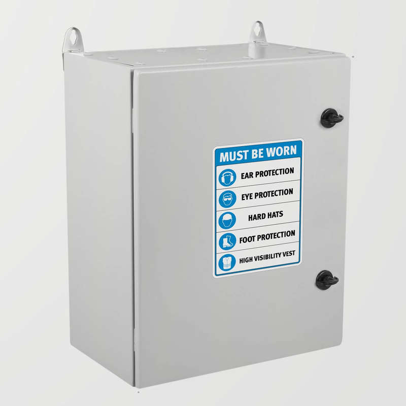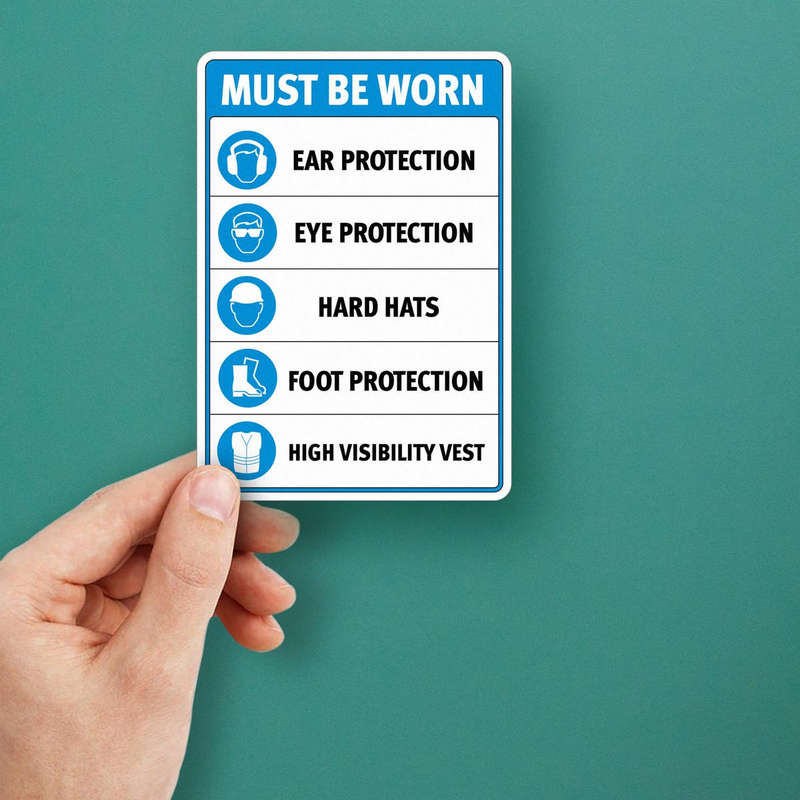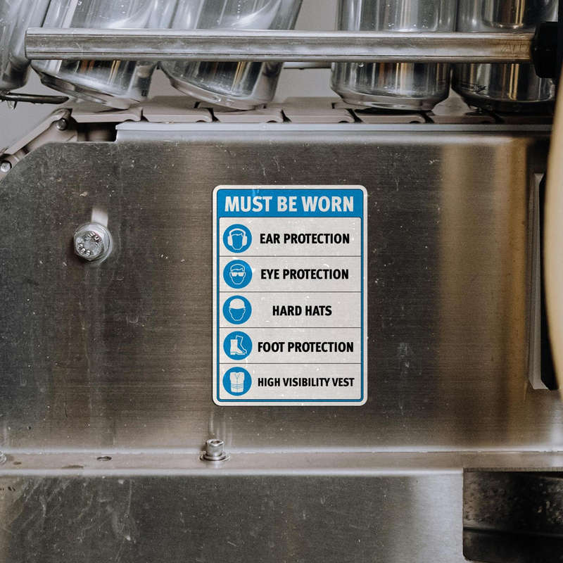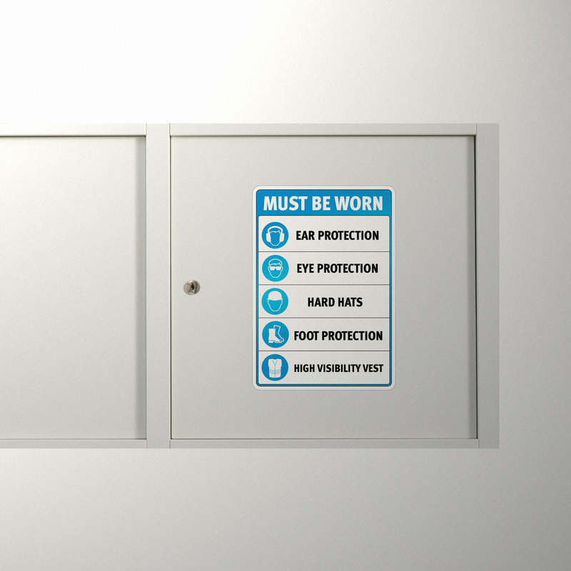 Ensure full compliance with workplace safety protocols using this “Must Be Worn” safety sticker. Designed to cover essential protective gear requirements, including ear protection, eye protection, hard hats, foot protection, and high-visibility vests, this decal provides a clear and effective reminder in high-risk environments. Featuring a bold blue and white design with crisp graphics, it stands out in industrial settings and ensures instructions are easily visible. Made from durable materials, it resists wear and tear, maintaining its clarity over time. Available in multiple sizes, this sticker fits doors, walls, or machinery for versatile placement. The strong adhesive backing ensures easy application and clean removal.