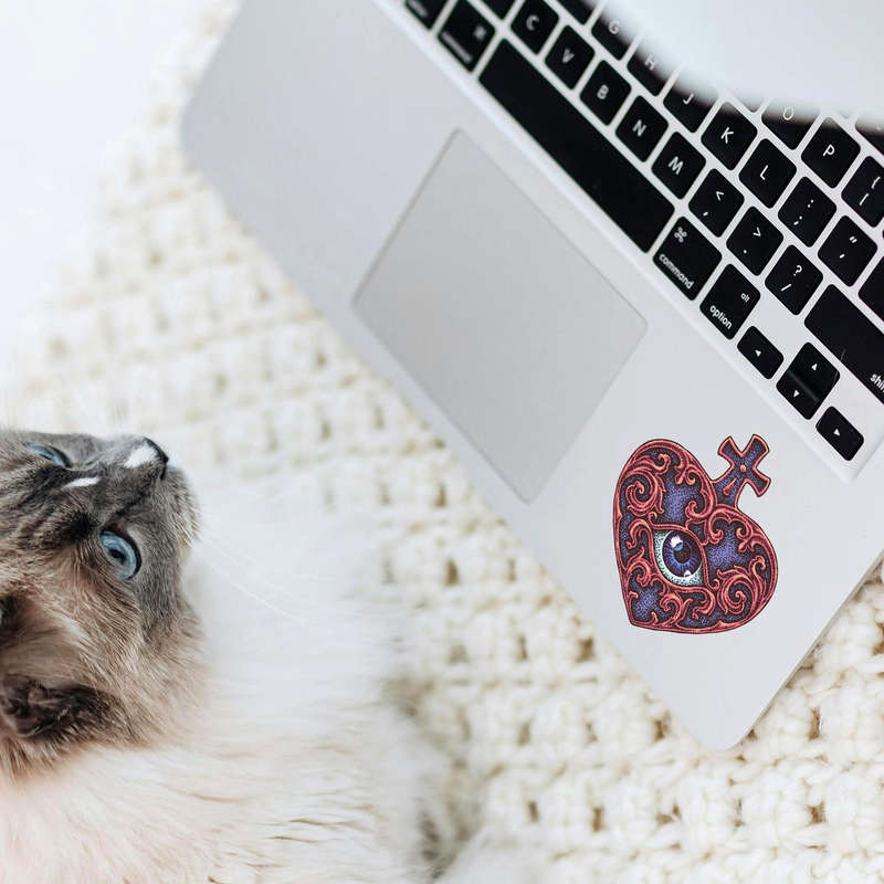 Elevate your personal style with this Mystical Eye Heart Sticker, featuring a beautifully detailed heart adorned with intricate ornate patterns, an all-seeing blue eye, and a cross. This tattoo-inspired vinyl decal adds a gothic and mysterious touch to your belongings. Crafted from high-quality, waterproof vinyl, it resists scratches and fading, ensuring the vibrant design lasts. Ideal for laptops, notebooks, phone cases, and more, this sticker is available in multiple size options to suit your creative needs. Its easy peel-and-stick application ensures a hassle-free way to personalize your accessories while leaving no residue behind. Add a unique blend of art and mystique to your world.