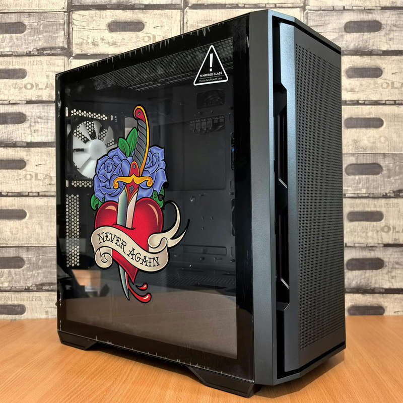Express your individuality with this bold “Never Again” heart and dagger sticker. Inspired by traditional tattoo art, the design features a vibrant red heart pierced by a dagger, framed by delicate blue roses and a dramatic banner. Made from high-quality vinyl, this durable decal is perfect for both indoor and outdoor use, resisting weather and fading over time. Ideal for laptops, cars, or walls, it’s a versatile way to showcase resilience and personal style. Available in multiple sizes, this striking decal is a perfect choice for adding an edge to your decor or accessories.