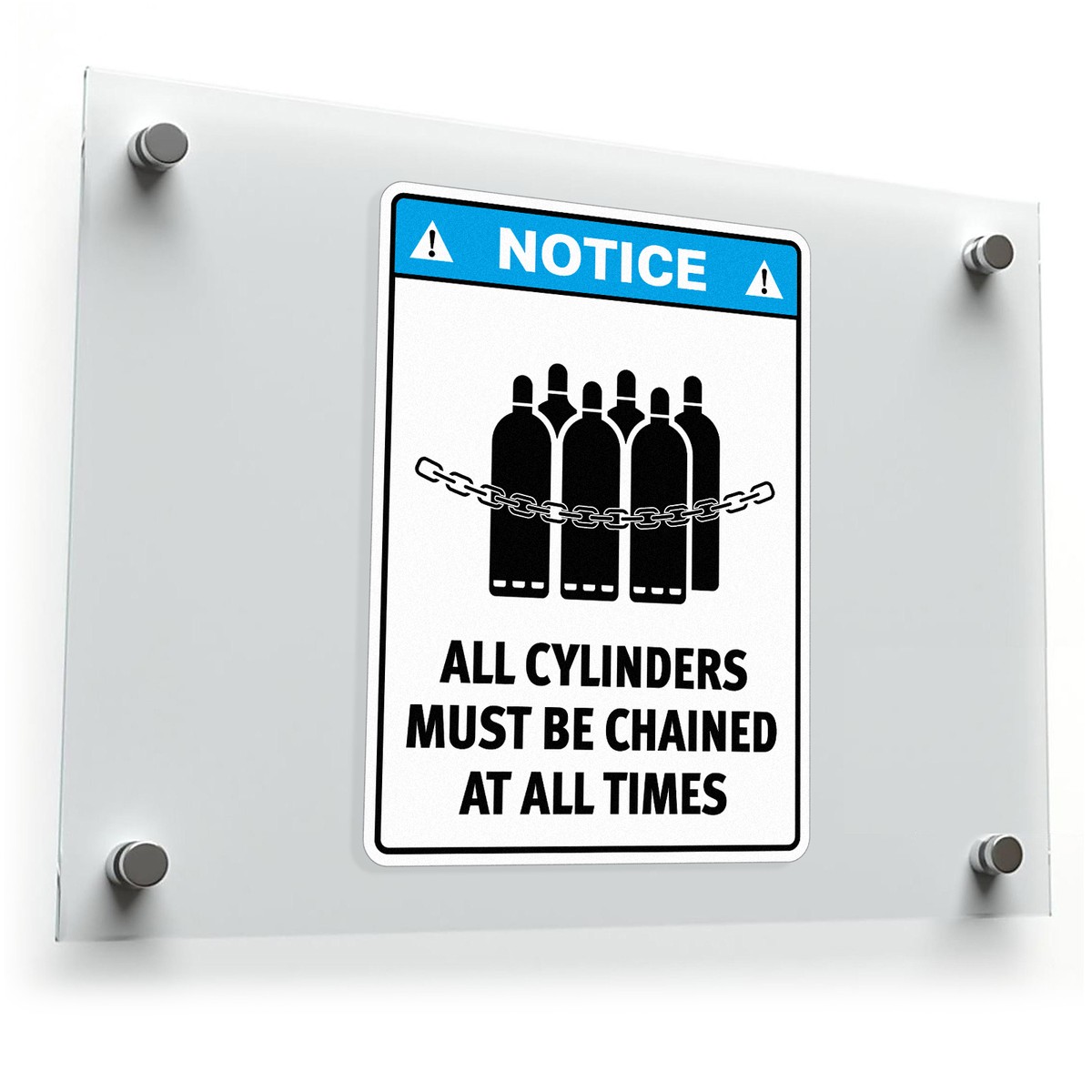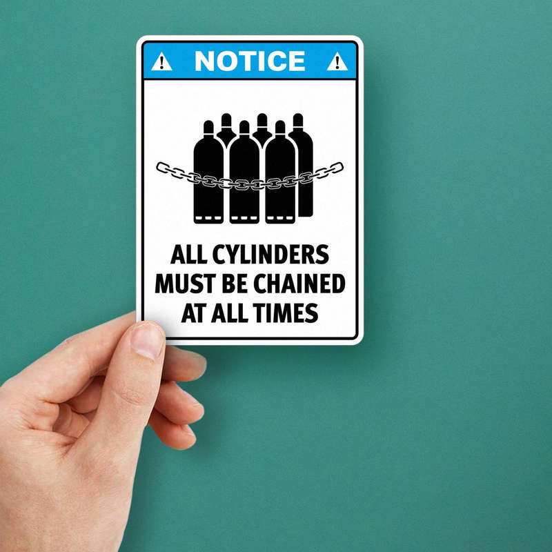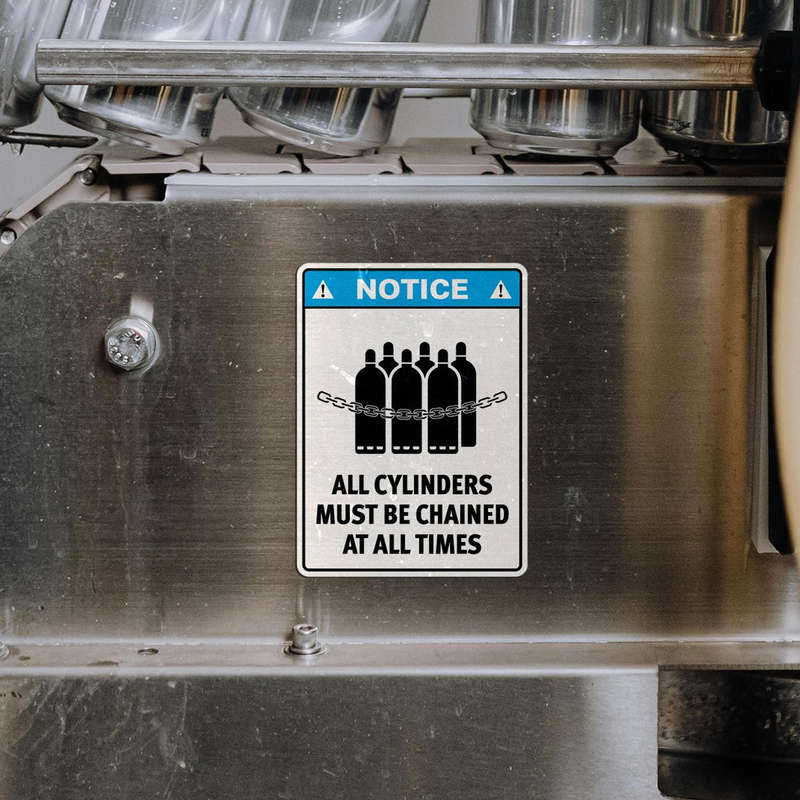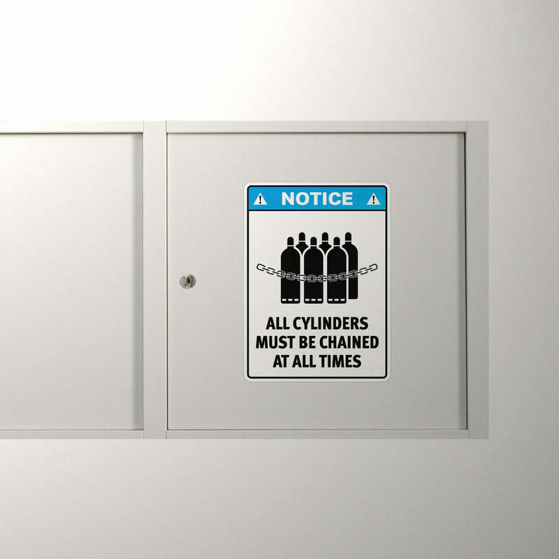 Promote a safer workplace with this “Notice: All Cylinders Must Be Chained” safety sticker, designed for industrial use. Crafted from durable, weather-resistant vinyl, this decal maintains its vibrant black and blue colors and clear lettering even in tough indoor or outdoor environments. Its adhesive backing ensures secure application to smooth surfaces like walls, doors, or equipment. Available in multiple sizes, it’s ideal for various settings, from large storage areas to smaller equipment zones. With its bold design and critical safety message, this decal is a must-have for maintaining compliance and awareness in any industrial workspace.