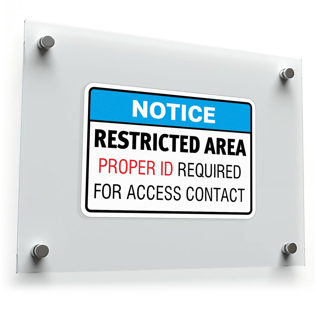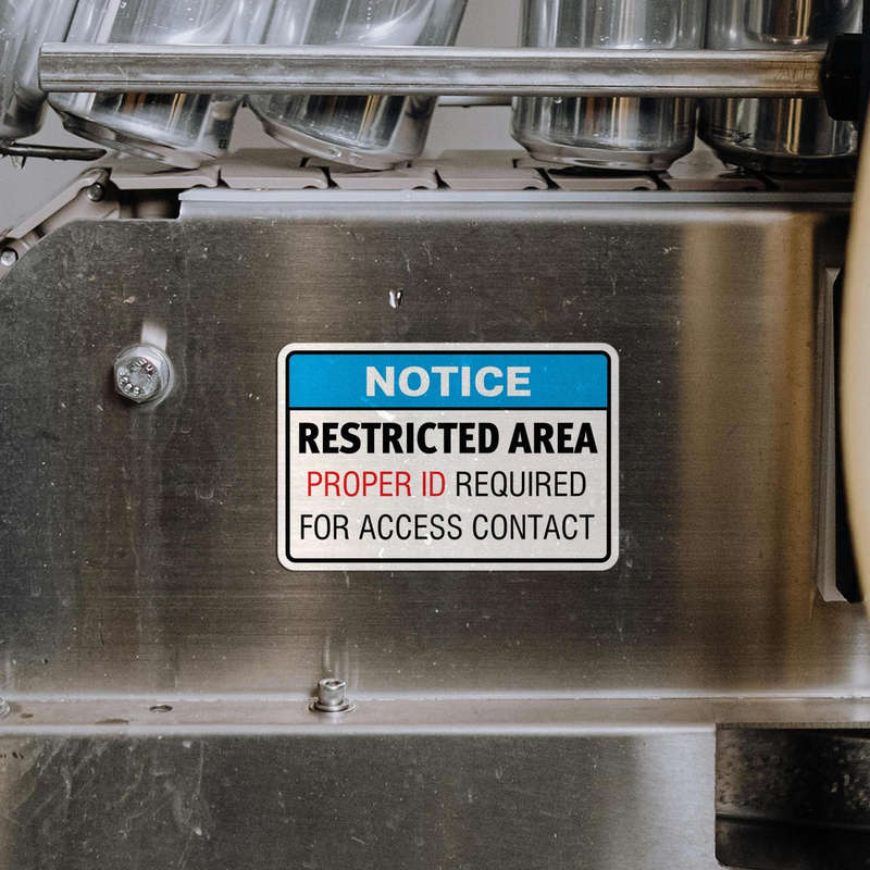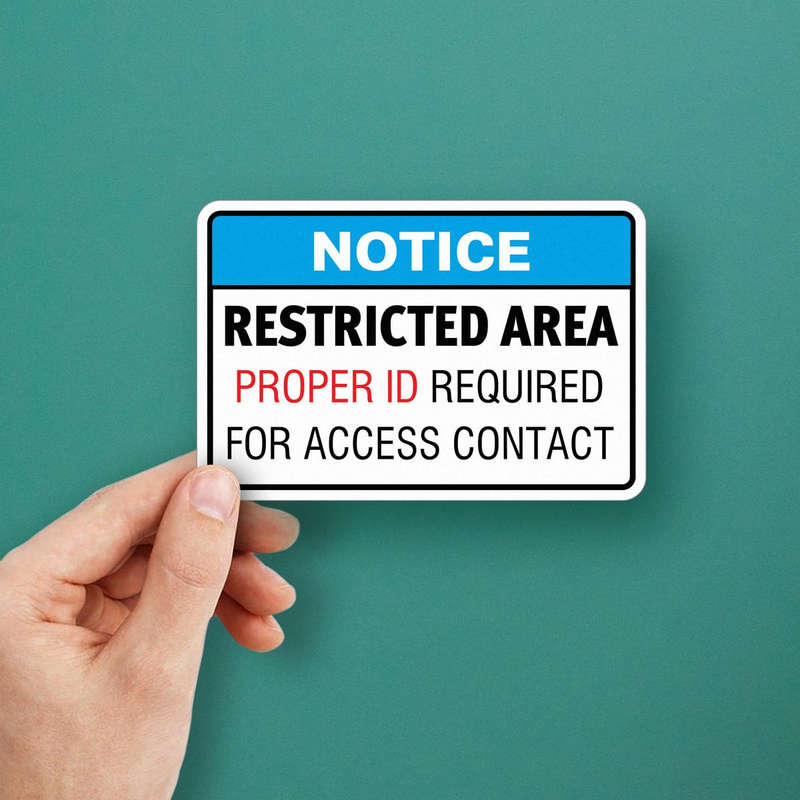 Ensure safety and security with this “Notice Restricted Area” sticker, crafted to communicate access control and ID requirements clearly. Featuring a bold blue, black, and white design, this durable vinyl decal is ideal for doors, walls, and entry points in workspaces, labs, or any area with restricted access. Made to withstand both indoor and outdoor conditions, it provides long-lasting clarity. Its residue-free removal feature allows for flexible application and repositioning. Available in multiple sizes, this safety sign sticker is an essential tool for workplaces focused on maintaining controlled and secure environments.