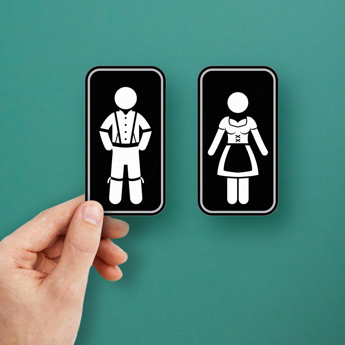 Bring the spirit of Oktoberfest to your venue with these fun and functional restroom sign stickers. Featuring traditional Bavarian outfits for men and women, these vinyl decals are perfect for distinguishing between restrooms at themed events or parties. Made from durable, high-quality vinyl, these stickers are designed to last and are easy to apply on any smooth surface, like bathroom doors. Whether for your home, bar, or restaurant, these Oktoberfest-themed restroom signs are a festive and playful addition to your decor. Available in multiple sizes to suit your needs.