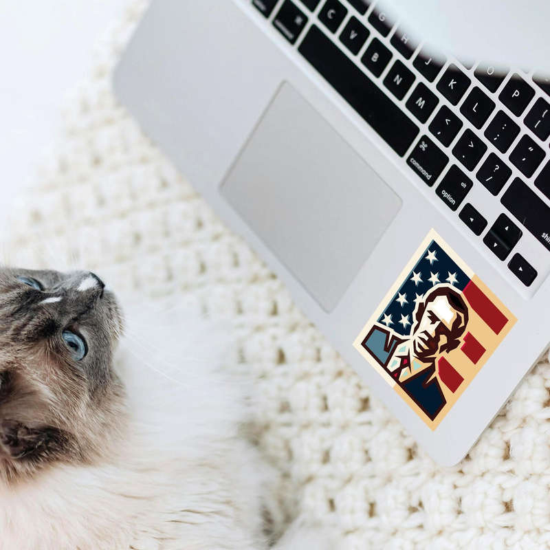 Showcase your patriotic pride with this bold and artistic sticker, featuring a striking portrait design set against a vibrant red, white, and blue American flag backdrop. Crafted from durable vinyl, this decal is waterproof, fade-resistant, and built to last on cars, laptops, walls, and more. Its modern graphic art style makes it a standout accessory, perfect for expressing your love for the USA. Easy to apply and remove, this sticker is ideal for anyone looking to add a patriotic touch to their personal items or decor. Available in multiple sizes, it’s a versatile and meaningful way to display your American spirit.