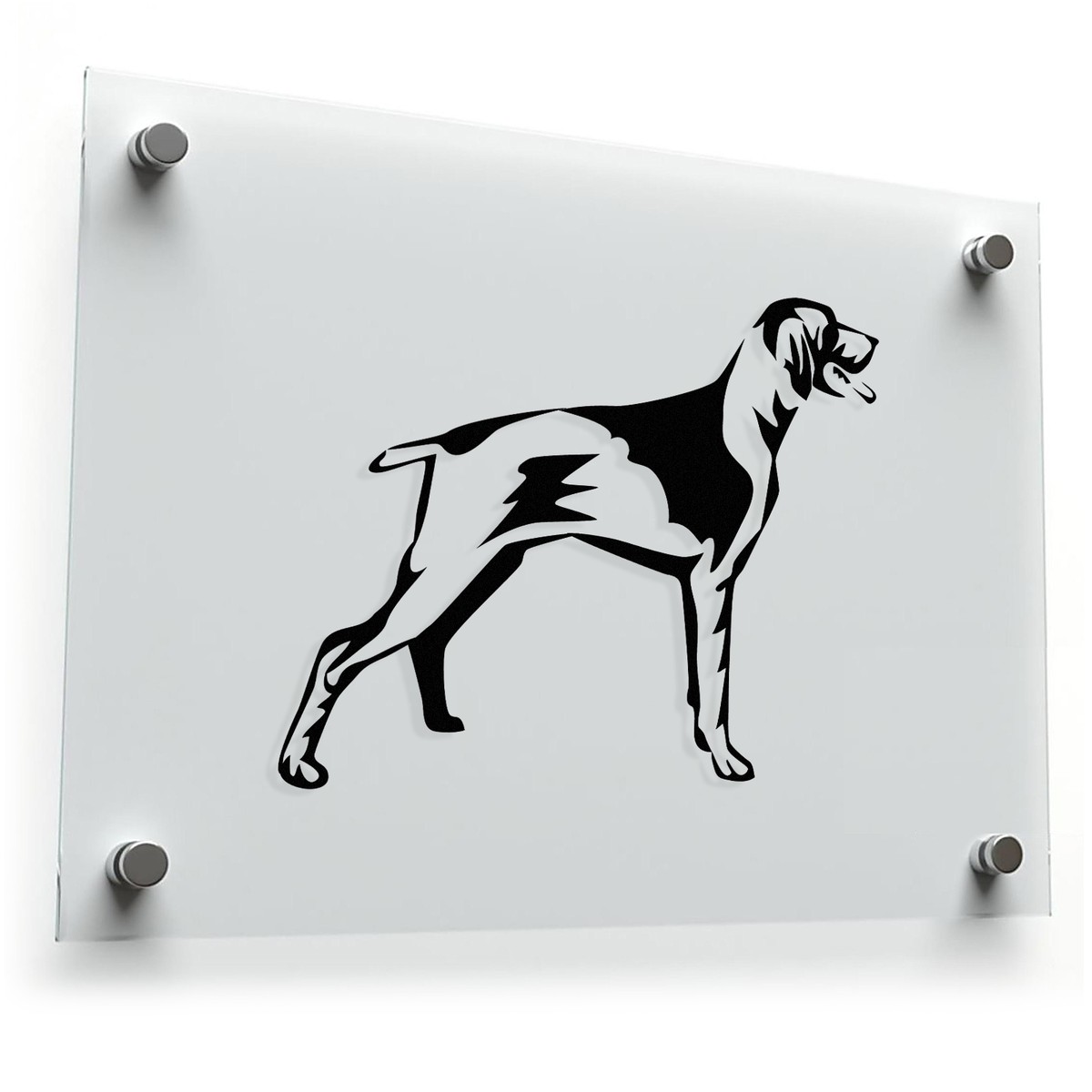 Show off your admiration for Pointer dogs with this elegant silhouette sticker. This high-quality vinyl decal is perfect for personalizing your car, laptop, or any smooth surface. The durable and weatherproof design ensures that the sticker will maintain its vibrant look, come rain or shine. The clean lines of the Pointer silhouette capture the grace and athleticism of this beloved breed. It’s a great way to express your love for dogs and add a touch of personality to your belongings. Available in Multiple Size Options. The image depicts a Pointer dog in a standing position, viewed in profile. The dog’s body is solid black, creating a striking silhouette against a white background. The design is minimalist and elegant, emphasizing the dog’s sleek physique and noble bearing.