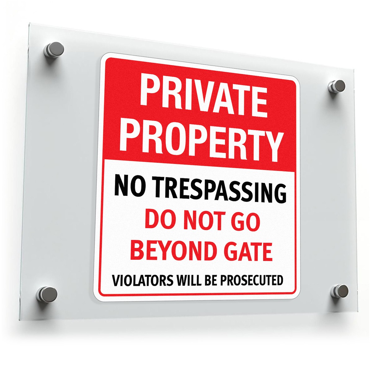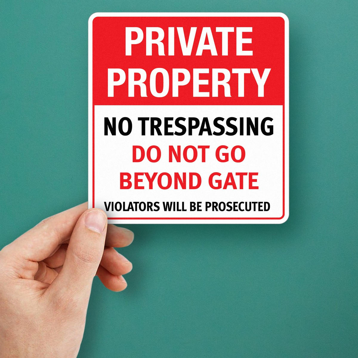 Protect your property with this bold and highly visible “Private Property No Trespassing” sign sticker. Featuring a durable and weatherproof vinyl design, this sign is ideal for outdoor use on gates, fences, or walls. The striking red and black colors make it easily noticeable from afar, effectively deterring unwanted entry. Easy to apply and remove without leaving any residue, this decal offers long-lasting protection for your private, commercial, or industrial property. Available in multiple sizes, it’s a reliable and convenient way to mark your boundaries and ensure security.