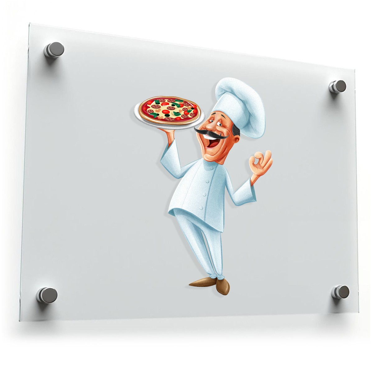 Add a dash of Italian charm to your kitchen or restaurant with this delightful Italian chef pizza sticker. Featuring a cheerful chef holding a vibrant pizza, this vinyl decal is ideal for creating a welcoming, playful atmosphere. The high-quality vinyl material ensures durability, with colors that stay bright over time, making it perfect for both home kitchens and lively dining spaces. Available in multiple sizes, this cartoon chef sticker brings a smile to any room, making it a great choice for food lovers and culinary spaces looking for a fun, unique touch.