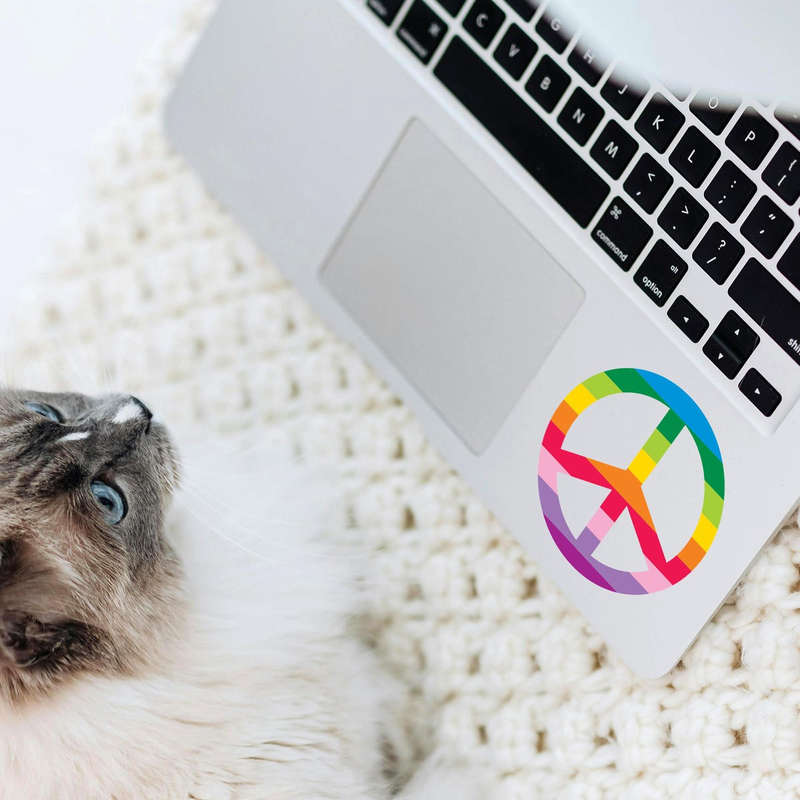 Spread a message of peace and positivity with this vibrant rainbow peace symbol vinyl sticker. Featuring a bold multicolor design, this decal is perfect for personalizing cars, laptops, windows, or home decor. Made from durable, weatherproof vinyl, it maintains its bright and vivid appearance through all weather conditions. Easy to apply and remove, the peel-and-stick design ensures hassle-free use and clean removal without residue. Whether as a personal statement or a thoughtful gift, this rainbow peace sticker brings color and meaning to any surface. Available in multiple size options to suit your needs.