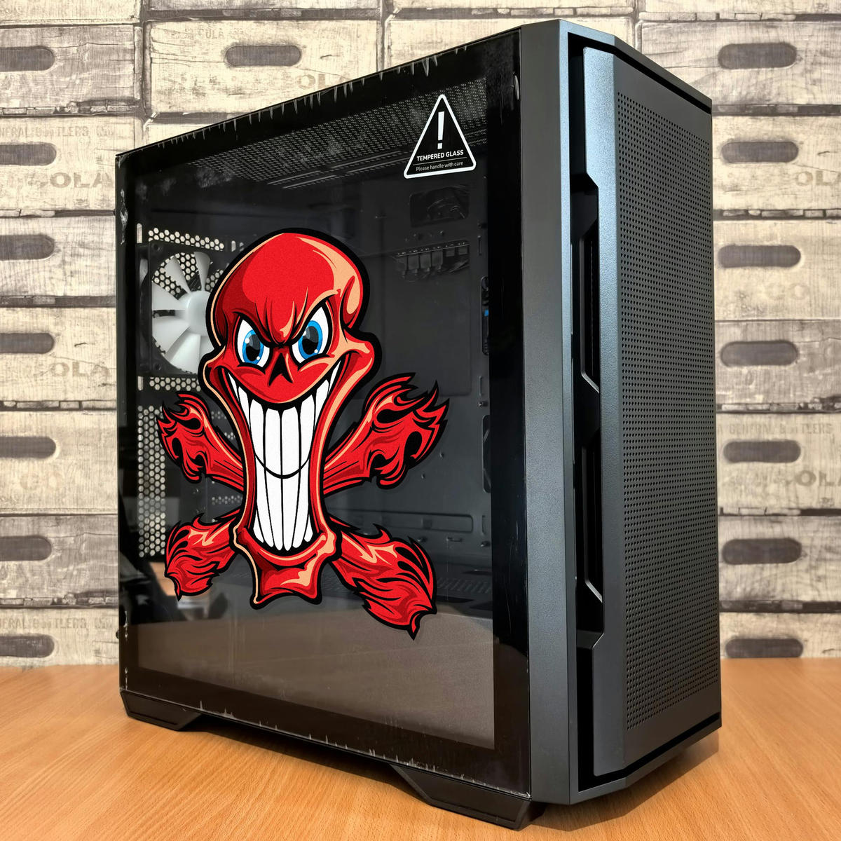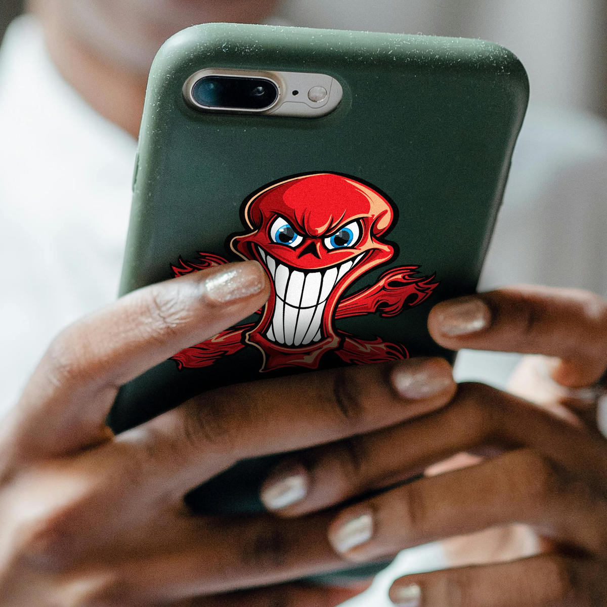 Red Grinning Skull with Flames Sticker 💀 Fierce Grinning Skull Design: This bold red skull with fiery flames and a wicked grin adds an aggressive and edgy touch to any surface, perfect for fans of bold, rebellious designs. 💀