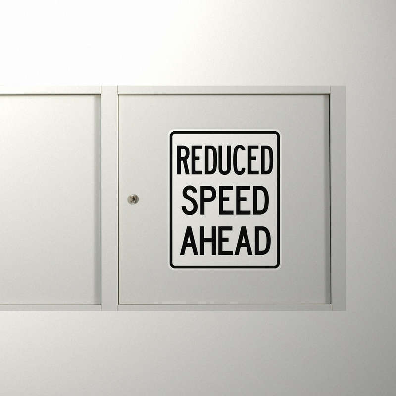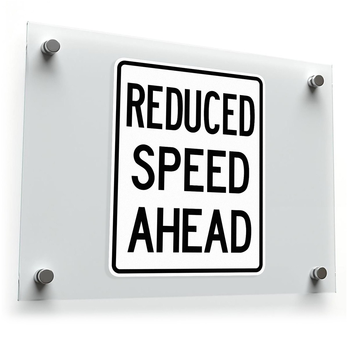 “Reduced Speed Ahead” Vinyl Sticker 🚦 Clear Traffic Safety Message: Ensure road safety with this “Reduced Speed Ahead” sticker, featuring bold black text on a white background for maximum visibility and clarity. 🚦