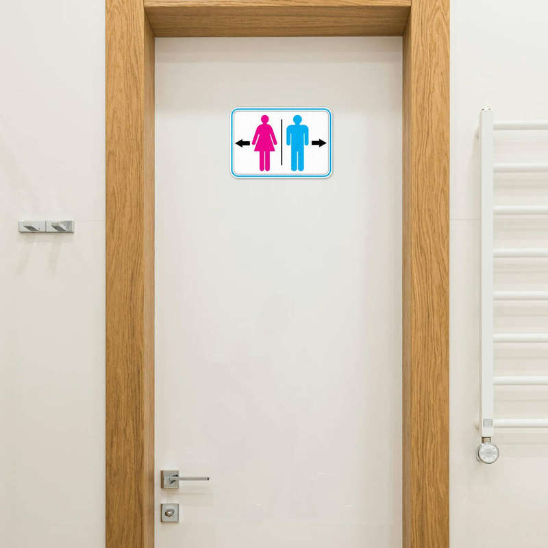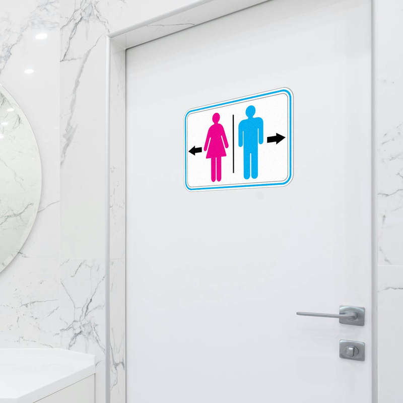 Bring clarity and style to your restroom signage with this vibrant pink and blue directional sticker. Designed with bold gender symbols, directional arrows, and a clean white background framed by a modern blue border, it offers a professional and eye-catching solution for any setting. Made from durable vinyl, this sticker is fade-proof, water-resistant, and built for long-lasting use indoors or outdoors. Its easy-to-apply design adheres smoothly to walls, doors, or flat surfaces and removes without hassle. Available in multiple sizes, this restroom decal is perfect for offices, events, or public spaces, ensuring seamless navigation for everyone.