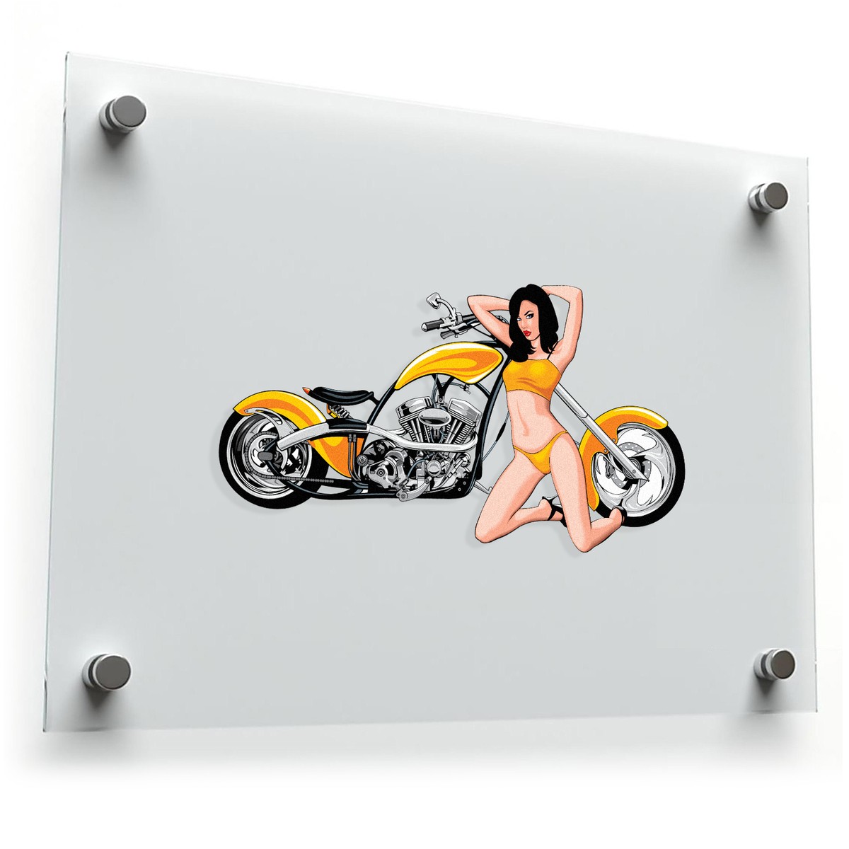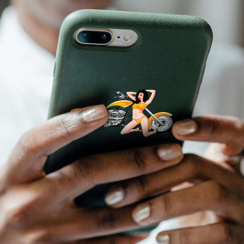 Retro Motorcycle and Pin🏍️ Bold Retro Design: This sticker features a vibrant yellow motorcycle and a classic pin-up girl, making it a perfect nod to vintage style and charm. Its striking colors and artistic design will stand out wherever it’s displayed! 🏍️