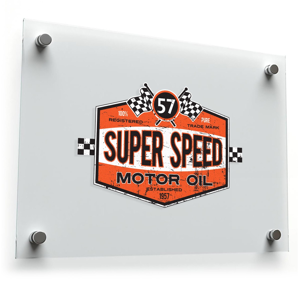 Capture the essence of classic motorsports with this retro Super Speed Motor Oil sticker. Perfect for car enthusiasts and vintage racing lovers, this decal is made from high-quality vinyl for durability, ensuring it holds up on cars, laptops, or garage walls. Its striking orange and black design, accented with racing flags, delivers bold style with a nostalgic flair. Available in multiple sizes, this sticker is easy to apply and remove, leaving no sticky residue behind. Add a touch of racing history to your space with this durable and removable vinyl decal.