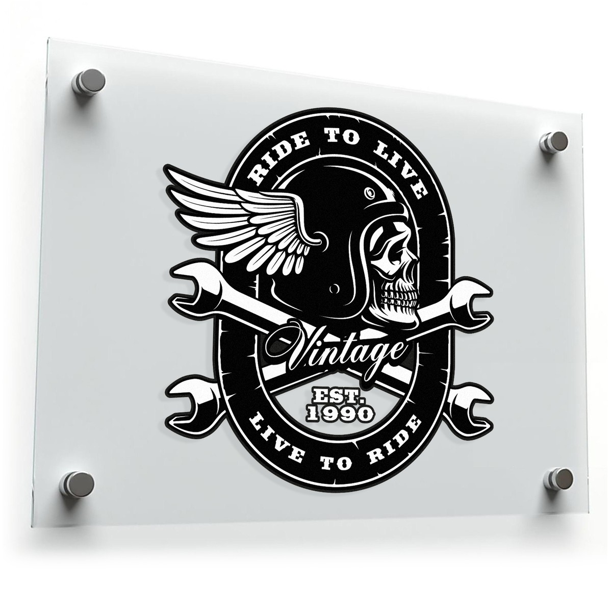 Ride to Live Skull Sticker 💀 Bold Vintage Design: Showcase your love for biking with this striking “Ride to Live, Live to Ride” skull sticker. The winged helmet and cross-wrench design create a powerful statement! 💀