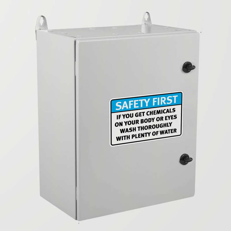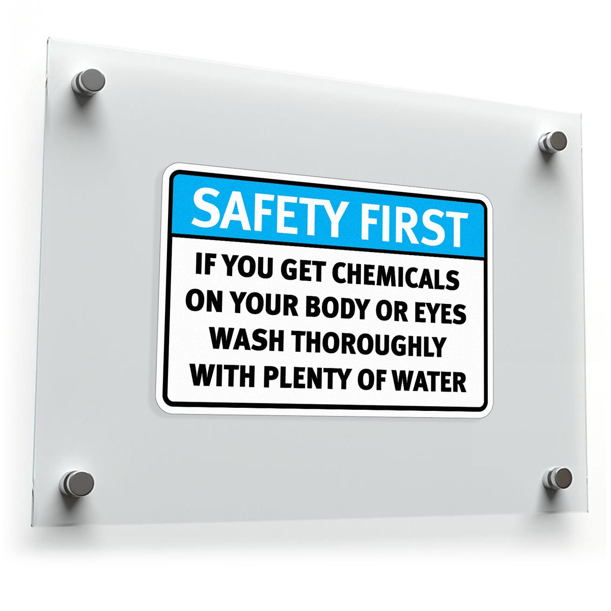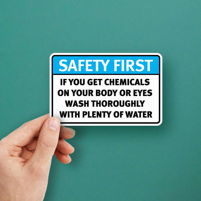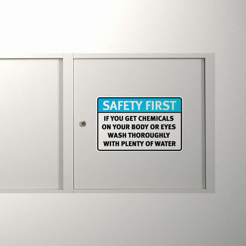 Enhance workplace safety with this “Safety First” chemical warning vinyl sticker. Featuring a bold blue and white design with clear instructions, it ensures critical safety information is visible and accessible. Crafted from durable, weatherproof vinyl, this decal withstands tough conditions, making it ideal for factories, laboratories, and workshops. Easy to apply and remove, it adheres securely to flat surfaces without leaving residue, offering flexibility for various applications. Available in multiple size options, this sticker is a reliable and professional addition to any workplace focused on safety and compliance.