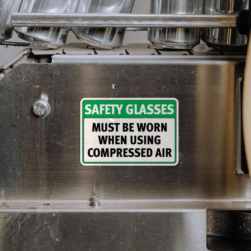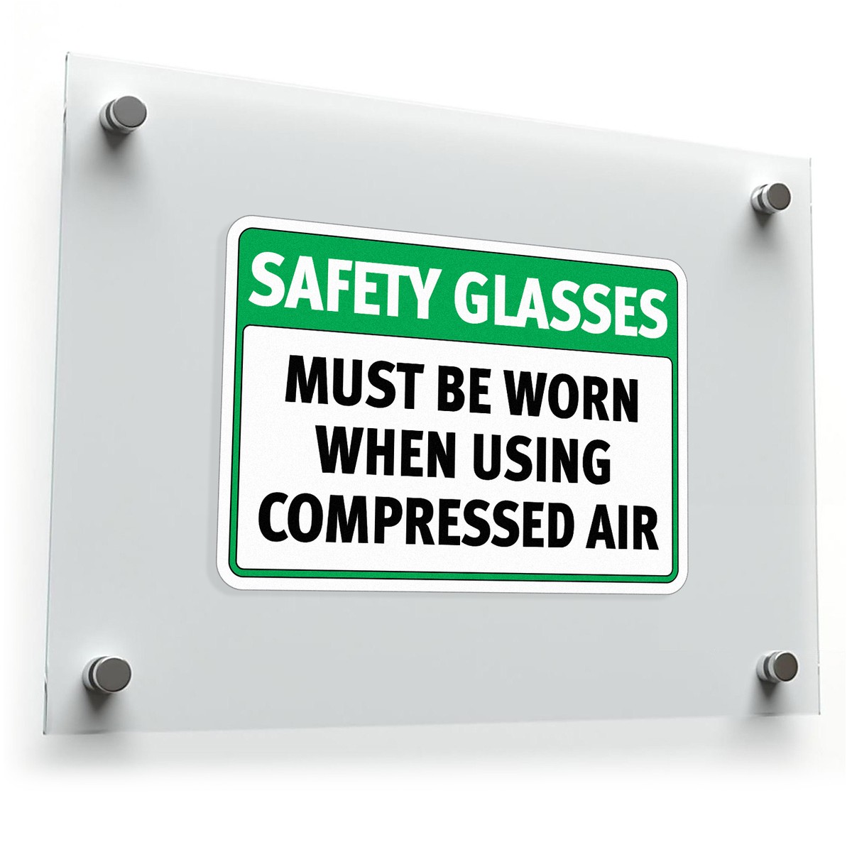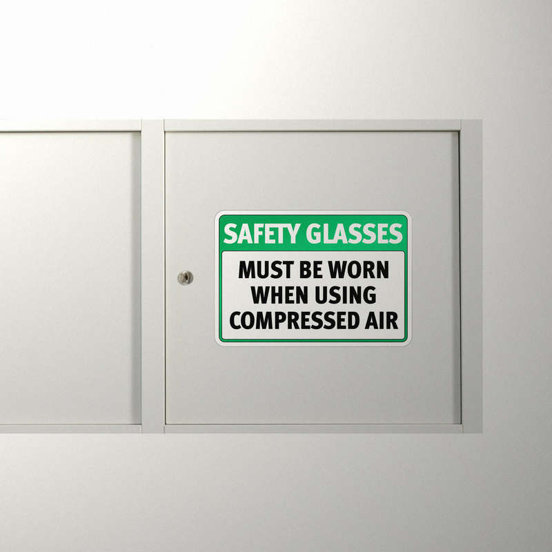 Ensure safety compliance in your workplace with this high-visibility vinyl sticker reading, “Safety Glasses Must Be Worn When Using Compressed Air.” Featuring bold black text on a green and white background, this decal is designed for maximum clarity. Made from durable, weatherproof vinyl, it resists fading and damage, making it suitable for both indoor and outdoor use. Its peel-and-stick application ensures quick and hassle-free installation on any smooth surface, from walls to machinery. Perfect for industrial or commercial environments, this sticker is an essential addition to maintain workplace safety and adhere to regulatory standards.