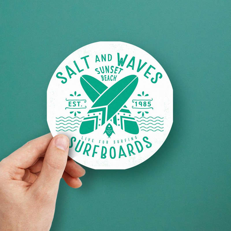 Bring the essence of surf culture to your daily life with the Salt and Waves Surfboards sticker. Designed with vibrant teal hues and a retro surfboard graphic, this decal captures the carefree beach spirit perfectly. Crafted from durable vinyl, it stands up to sun, sand, and water, making it ideal for outdoor and indoor use. Whether adorning your car, laptop, or water bottle, this versatile sticker is a stylish way to showcase your love for the waves. Available in multiple size options, it’s the perfect gift for surfers or beach enthusiasts looking to add a touch of tropical flair to their belongings.