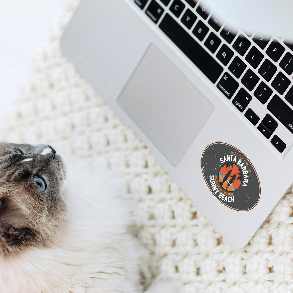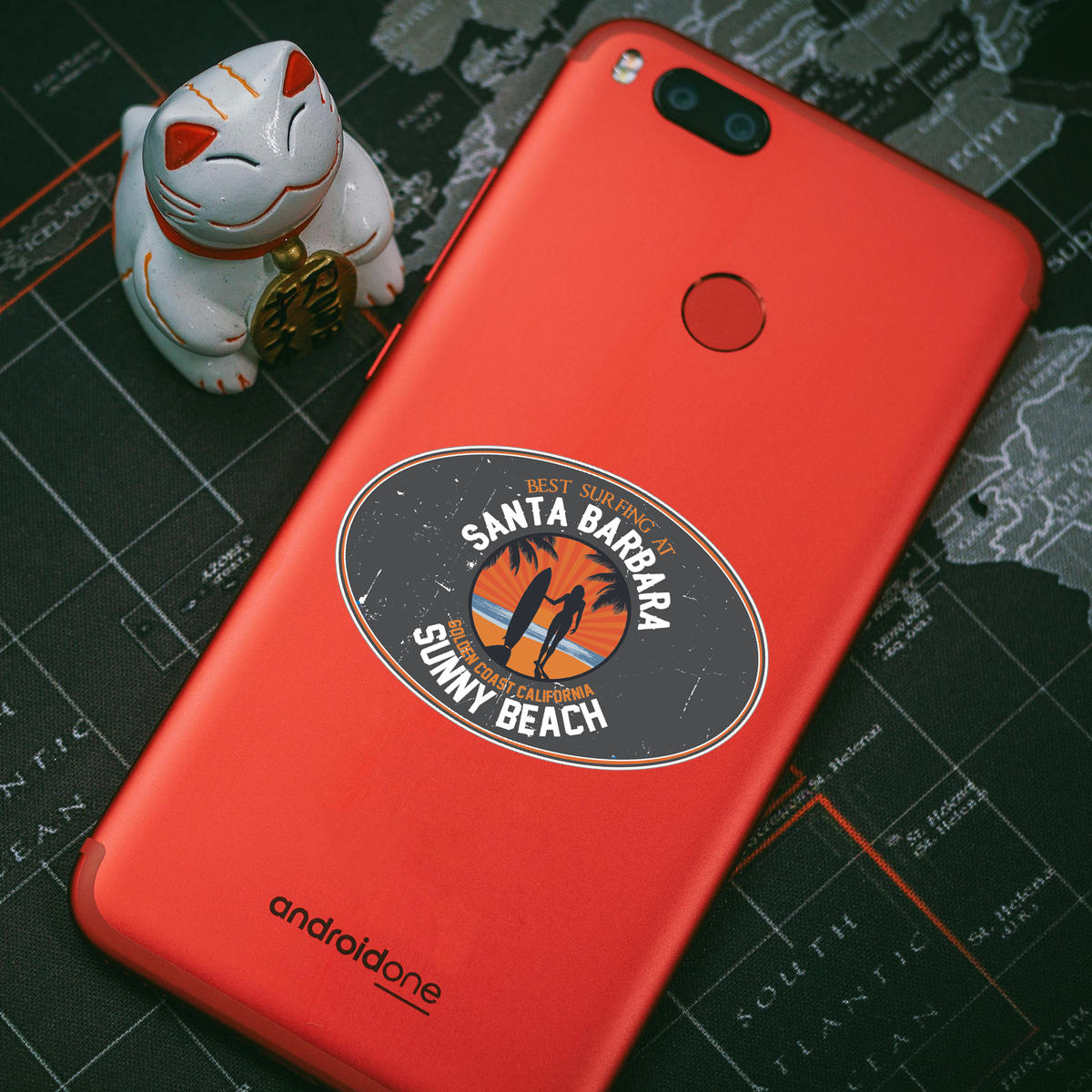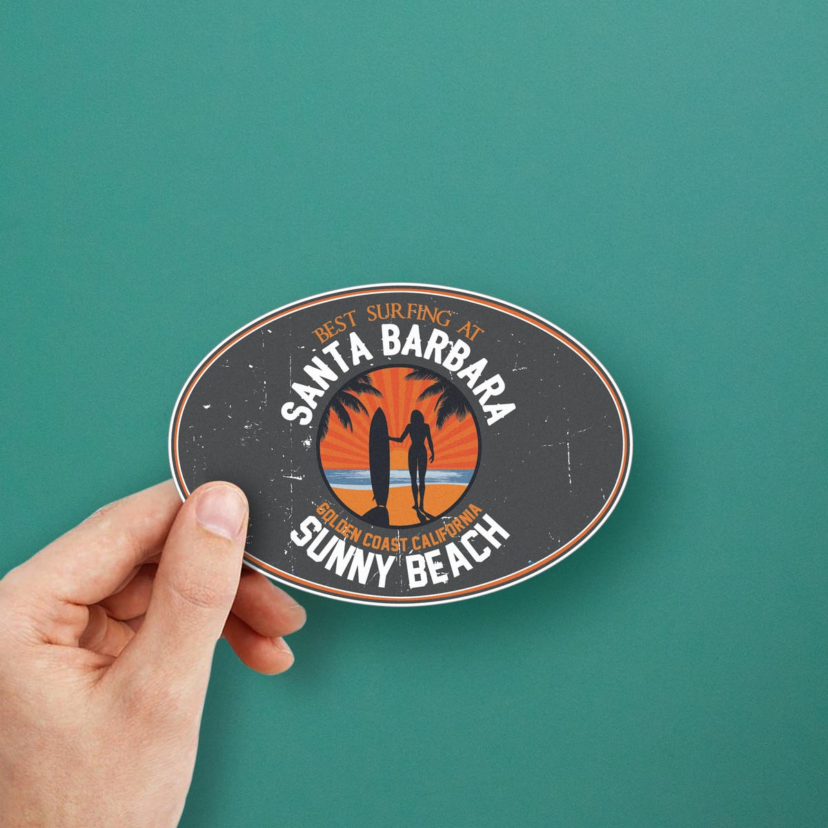 Capture the spirit of California’s Golden Coast with this retro Santa Barbara surfing sticker. Featuring a vintage beach design, this decal is perfect for adding a coastal vibe to your car, laptop, or water bottle. Made from durable, weatherproof vinyl, it’s designed to withstand outdoor conditions without fading or peeling. Easy to apply and remove, this sticker offers flexibility for personalizing your favorite items. Available in multiple sizes, this decal is a must-have for beach lovers and surfers alike.