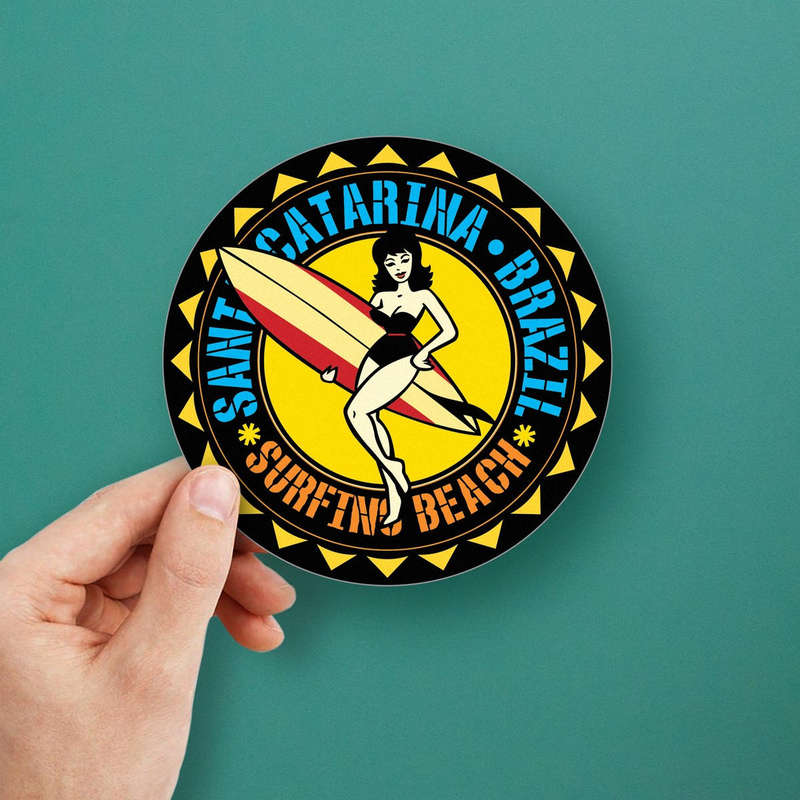Celebrate the vibrant beach culture of Santa Catarina, Brazil, with this retro surfer girl decal. Featuring a bold, vintage-inspired design, this sticker showcases a classic pin-up surfer girl, capturing the tropical vibes of one of Brazil’s surfing paradises. Perfect for decorating cars, laptops, walls, and travel gear, this high-quality vinyl decal is resistant to fading and wear, making it suitable for both indoor and outdoor use. Easy to apply and residue-free upon removal, it’s available in multiple sizes, allowing you to add a colorful, nostalgic touch to your space or belongings.
