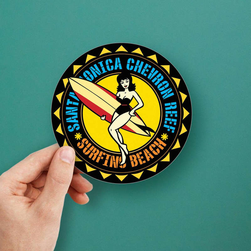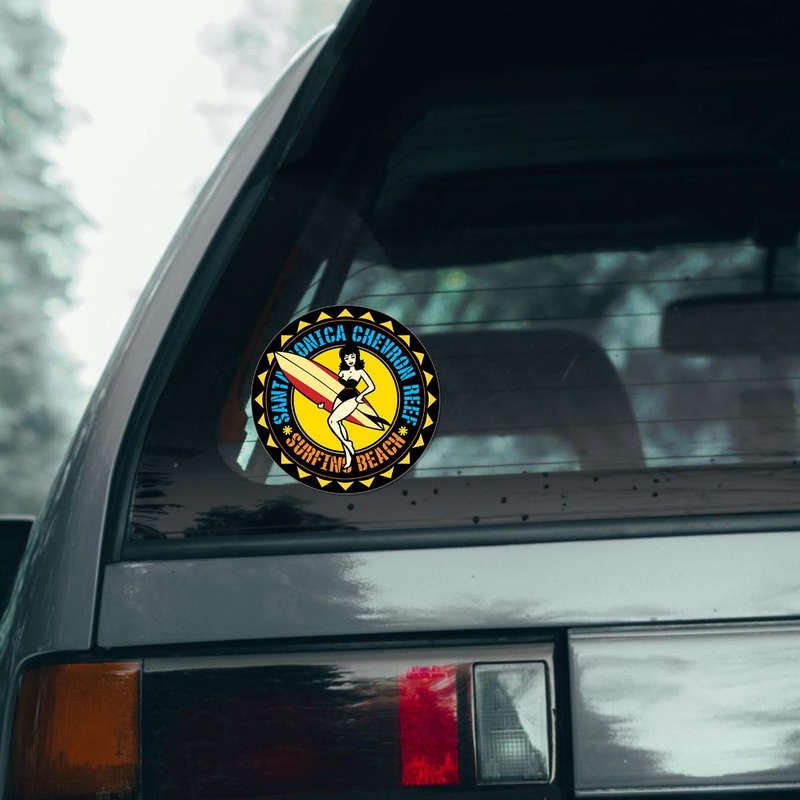 Capture the timeless charm of surf culture with this Santa Monica Chevron Reef Surfer Girl sticker. Featuring a bold retro design with vibrant yellow, black, and red tones, this premium vinyl decal is perfect for adding a splash of beach nostalgia to your car, laptop, walls, or other surfaces. Durable and weatherproof, it resists sun and water exposure, ensuring long-lasting use both indoors and outdoors. Its easy application and residue-free removal make it a hassle-free way to personalize your items. Available in multiple size options, this sticker is an ideal gift for beach enthusiasts or anyone who loves the carefree vibe of the Santa Monica coastline.
