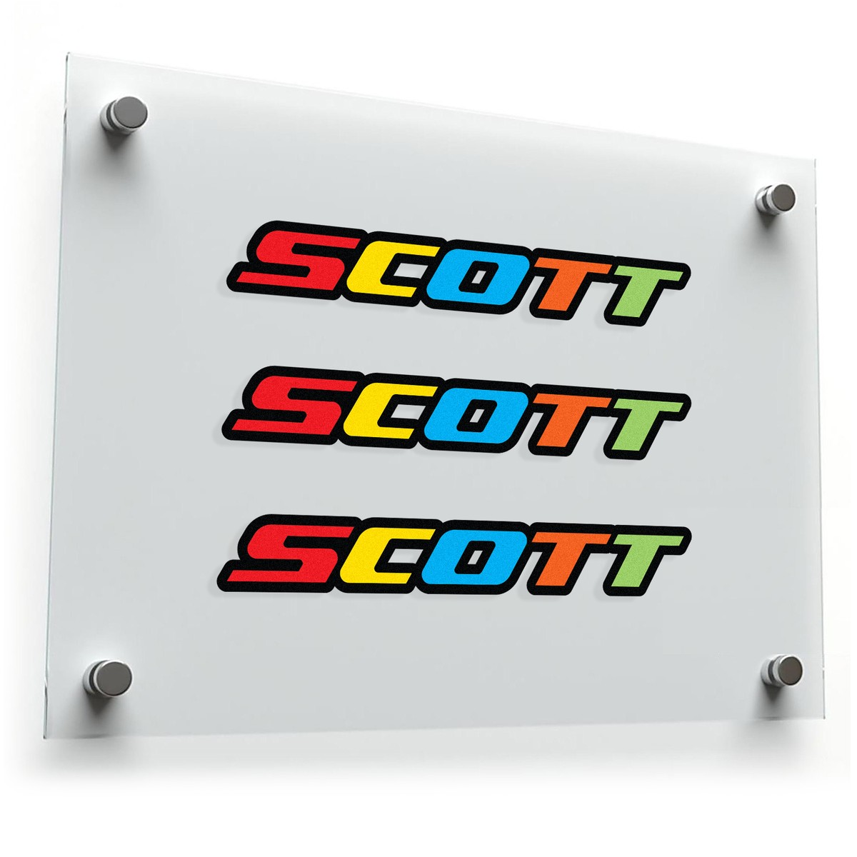 Scott Logo Vinyl Stickers 🚴 Vibrant Scott Logo Design: This set of multi-color Scott logo vinyl stickers adds a bold and dynamic touch to bikes, helmets, and outdoor gear for cycling enthusiasts. 🚴