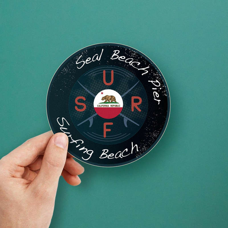 Celebrate the iconic surf culture of Seal Beach Pier, California, with this “Seal Beach Pier California” round vinyl decal. Highlighting the California Republic emblem, crossed surfboards, and modern typography, this sticker is perfect for personalizing surfboards, cars, laptops, or other smooth surfaces. Made from durable weatherproof vinyl, this decal is fade-resistant and ideal for both indoor and outdoor use. Easy to apply and remove without leaving residue, it’s great for surfers, travelers, and anyone who loves California’s coastal charm. Available in multiple sizes, this decal adds a touch of California style to your belongings.