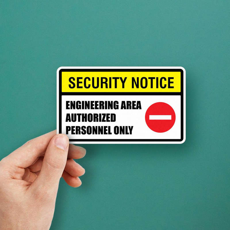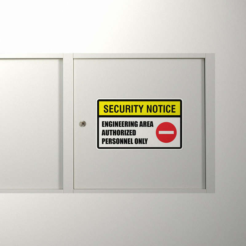 Ensure workplace safety with this Security Notice Engineering Area sticker, clearly marking restricted zones with the message “Authorized Personnel Only.” Featuring a bold yellow, black, and red design, this durable vinyl decal is weatherproof and fade-resistant, making it suitable for indoor and outdoor use. Its highly visible layout ensures immediate recognition, helping to maintain compliance and safety in engineering areas or other controlled environments. Easy to apply and residue-free when removed, this sticker is a reliable solution for marking restricted spaces. Available in multiple size options for versatile applications.