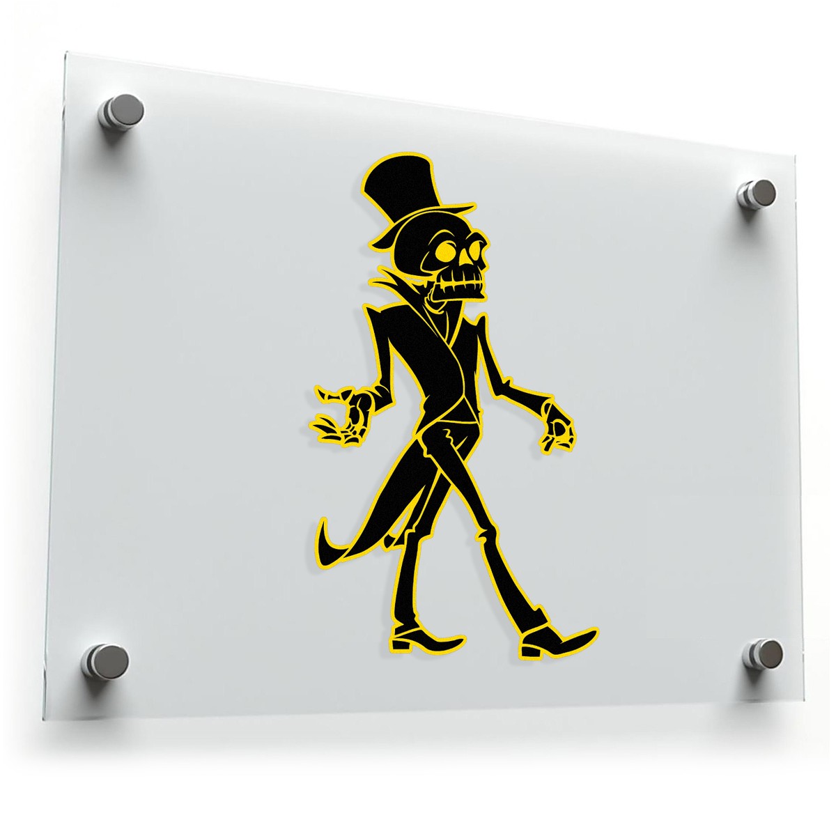 Bring a touch of spooky elegance to your space with this Skeleton Gentleman design decal. Featuring a dashing skeleton in a top hat and coat, the decal’s black silhouette is highlighted with vibrant yellow for a bold, gothic-inspired aesthetic. Perfect for Halloween decorations or gothic-themed decor, it works great on cars, laptops, walls, and more. Made from durable, weatherproof vinyl, this sticker resists UV rays and water, ensuring long-lasting color and quality indoors or outdoors. The strong adhesive backing ensures smooth application to flat surfaces, and the decal removes easily without leaving residue. Available in multiple size options, this decal is a stylish way to showcase your love for the spooky and sophisticated.