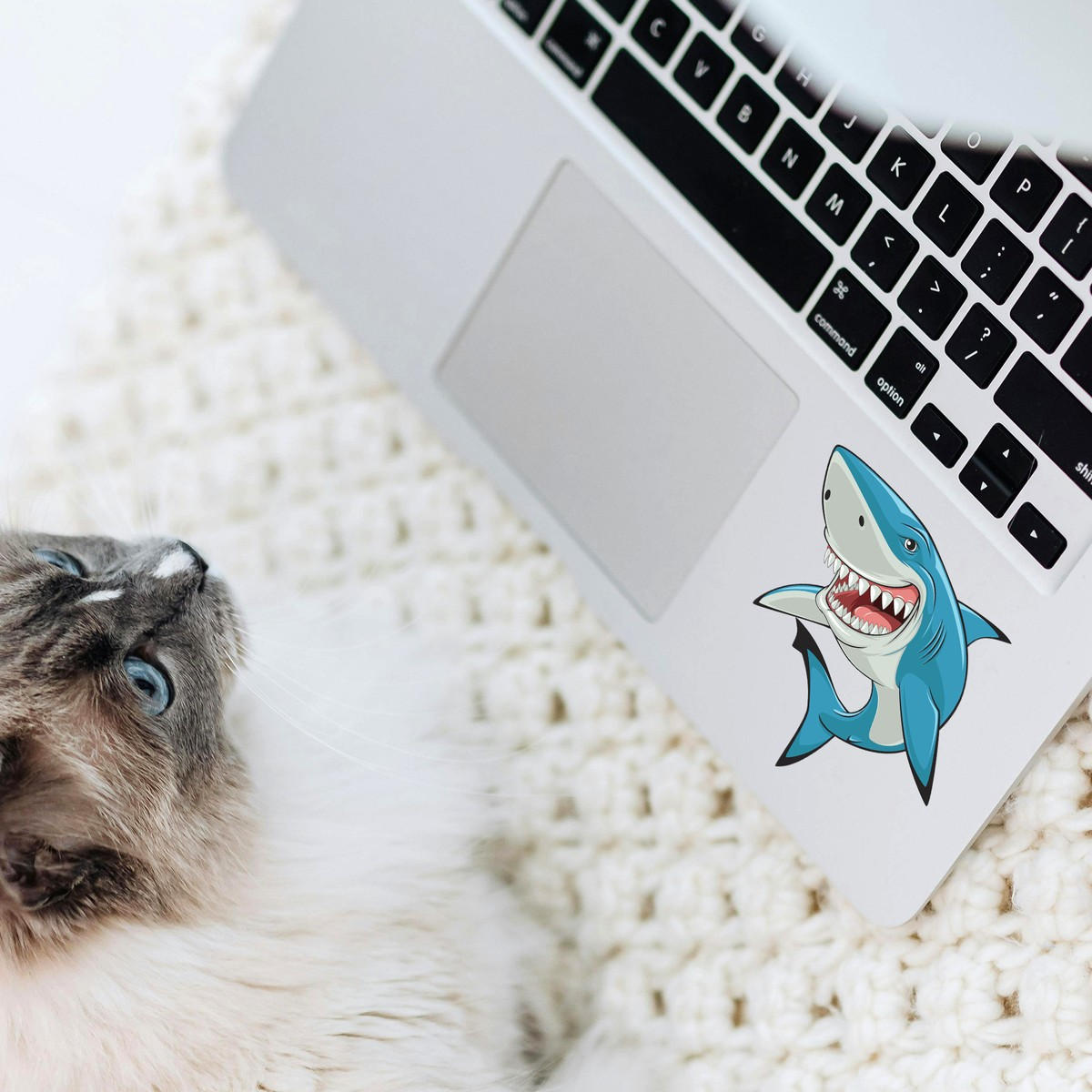 Smiling Blue Shark Sticker 🦈 Playful Shark Design: This smiling blue shark sticker features a fun and cartoonish design with sharp details, adding a cheerful and adventurous touch to your belongings. 🦈