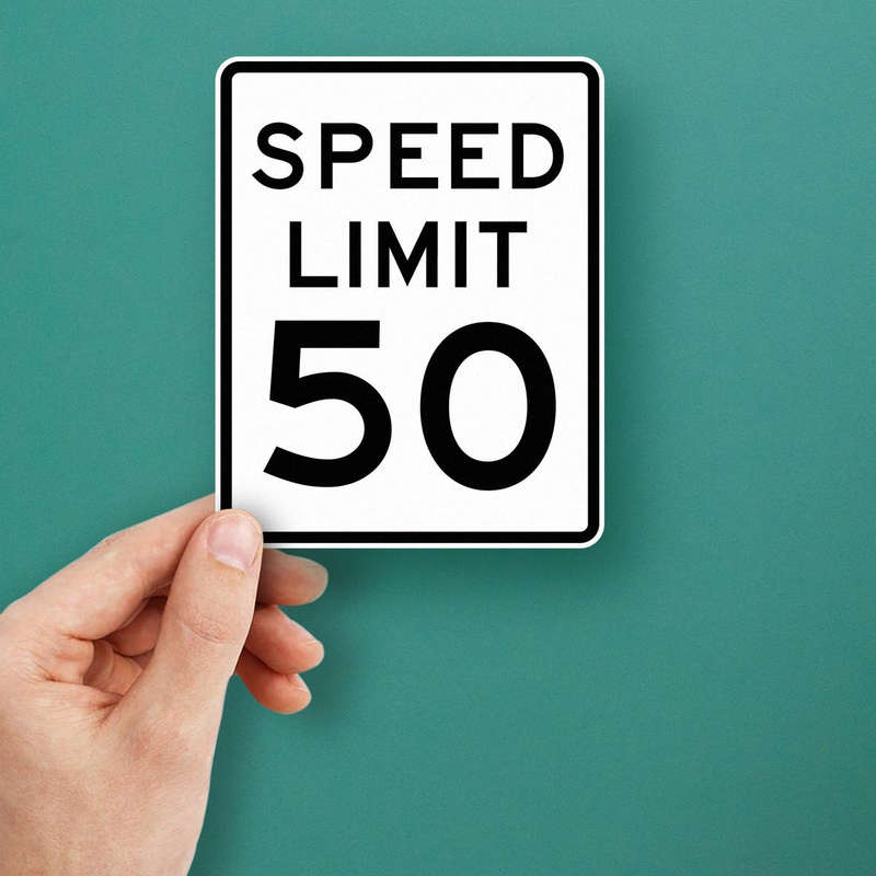 Promote road safety and compliance with this “Speed Limit 50” vinyl sticker. Featuring bold black text and numbers on a white background, this decal ensures high visibility and clear communication for traffic control. Crafted from durable, water-resistant vinyl, it is designed to withstand outdoor conditions while maintaining its clarity and vibrant details. Perfect for vehicles, roads, workplaces, or safety zones, this sticker adheres securely and removes cleanly without leaving residue. Whether for professional or personal use, it provides a practical solution for traffic management and safety enforcement. Available in multiple size options to meet your specific requirements.
