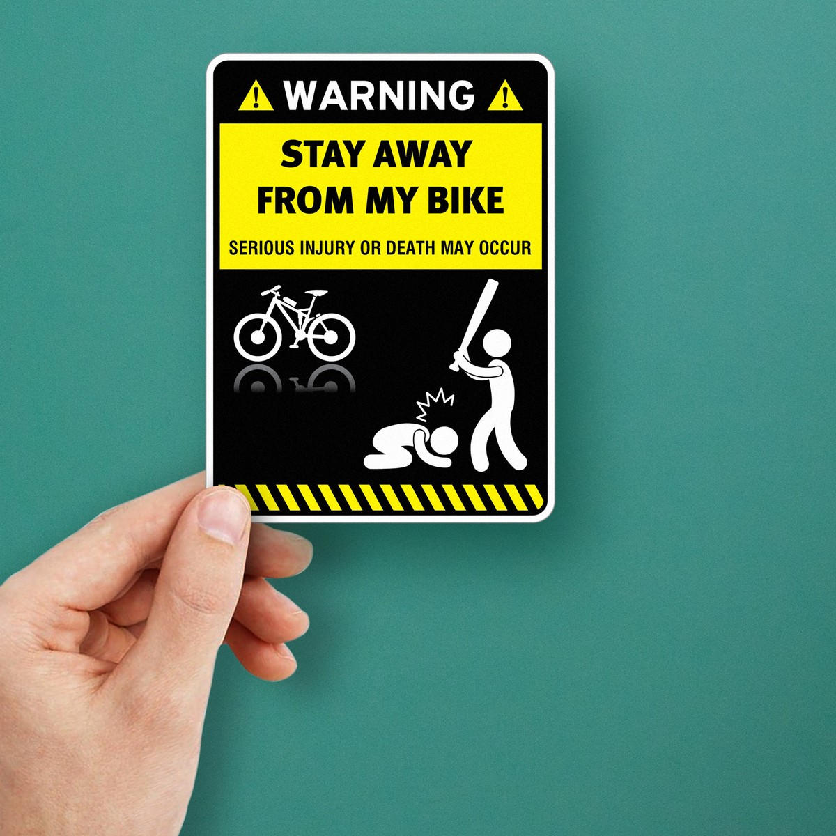 Add a layer of protection and personality to your bike or vehicle with this humorous “Stay Away From My Bike” warning sticker. Made from durable vinyl, this bold decal is designed to deter potential thieves while giving your property a unique flair. With its high-visibility yellow and black design, the sticker is easy to spot and remains vibrant in any weather condition. Perfect for bikes, vehicles, or personal property, this sticker is simple to apply and built to last, ensuring that your message stays clear for years to come.