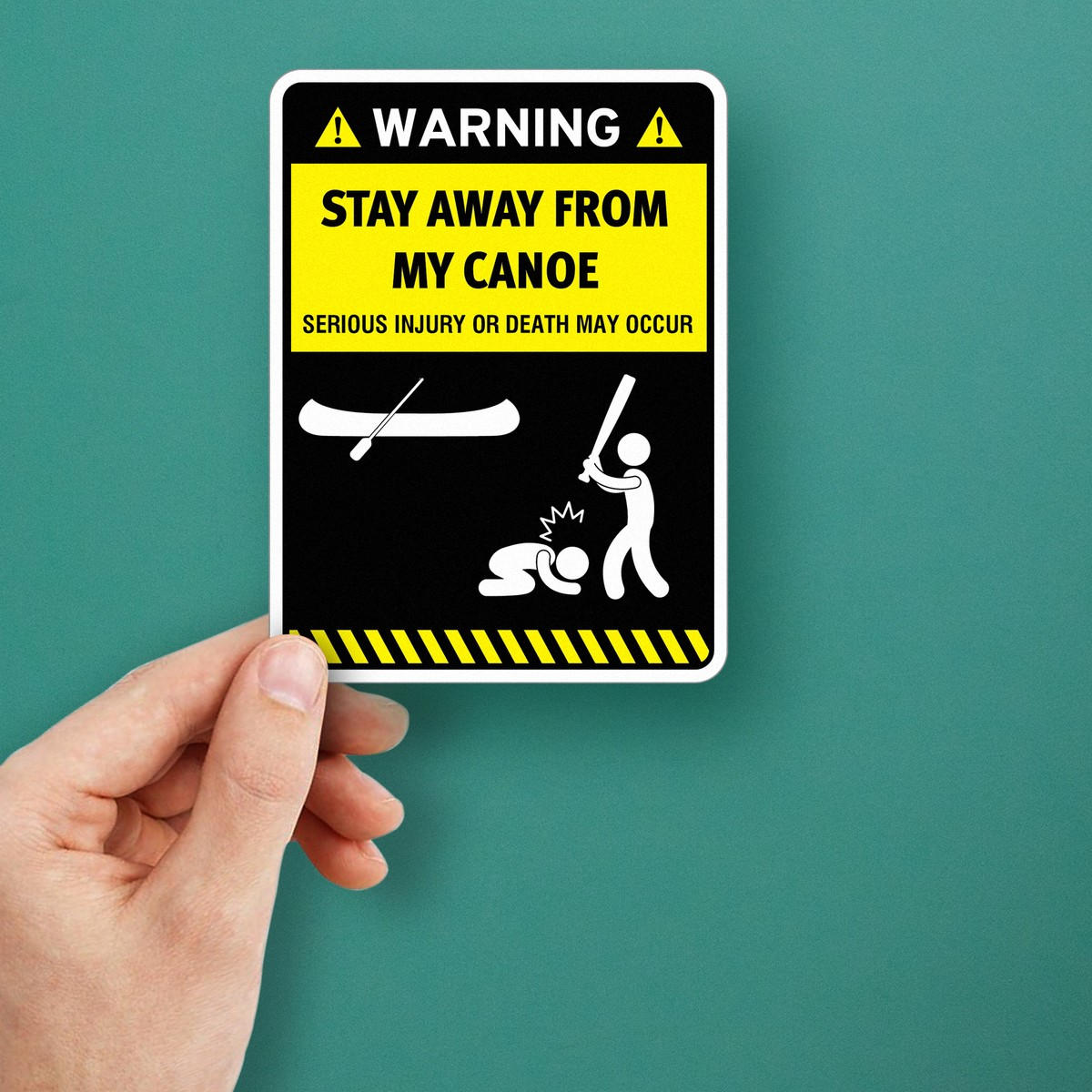 Add a humorous yet clear message to your canoe or outdoor space with this “Stay Away from My Canoe” warning sticker. Featuring a bold design and funny safety message, this vinyl decal is perfect for keeping your canoe safe from unwanted guests. Available in three sizes, it’s easy to apply and remove without leaving residue behind. Made from durable, weather-resistant vinyl, this sticker is designed to last through outdoor elements, making it a perfect addition to canoe areas, backyards, or lakeside spots. Add a bold, fun touch to your canoe area with this clever warning decal.